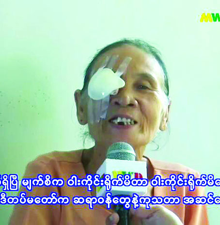 ၂။ မျက်စိကို ဝါးကိုင်းရိုက်တာ သုံးနှစ်ရှိပြီ။ တပ်မတော်က ဆရာဝန်တွေနဲ့ ဆေးကုသတာ အဆင်ပြေတယ်။ အရင်တစ်ခါ အခုလိုဆေးလာကုတာ မသိလိုက်ဘူး။ ဒီတစ်ခါတော့ သိတာနဲ့ ချက်ချင်း လာကုလိုက်တယ်။ အခုလို ဆေးလာရောက်ကုပေးတဲ့အတွက် ဆရာဝန်တွေ၊ ပါရဂူတွေ၊ ဆရာမတွေ အားလုံးလည်း ကျန်းကျန်းမာမာနဲ့ ချမ်းချမ်းသာသာ နဲ့ရှိကြပါစေ။ မိသားစုစိတ်ဓာတ် ရှိကြတဲ့အတွက် အားလုံးကိုလည်း ကျေးဇူးတင်ပါတယ်။ စီစဉ်ပေးတဲ့လူကြီးတွေကိုလည်း ကျေးဇူးတင်ပါတယ်။