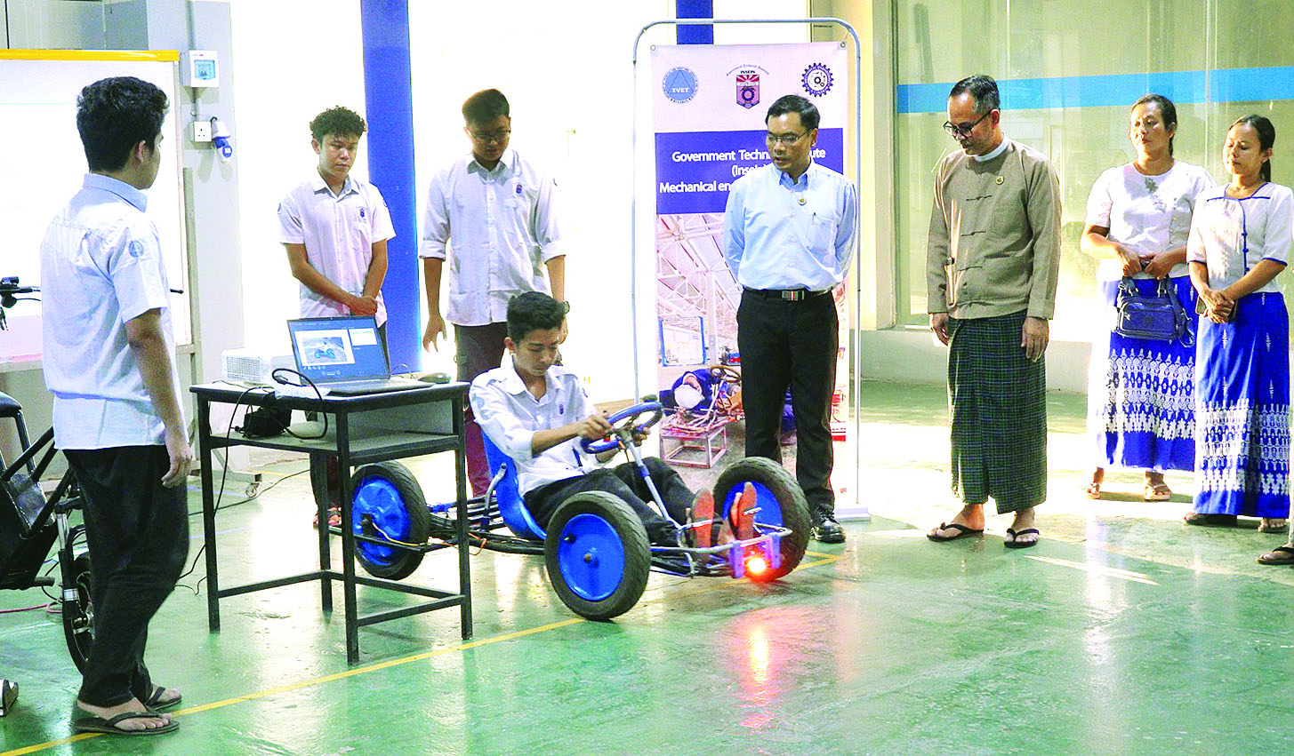 ဆက်လက်၍ အစိုးရစက်မှုလက်မှုသိပ္ပံ (အင်းစိန်) EV အလုပ်ရုံ ၌ ကျောင်းသား ကျောင်းသူများ အဆင့်မြင့်သင်ထောက်ကူပစ္စည်းများဖြင့် လက်တွေ့လေ့ကျင့်နေမှု၊ နောက်ဆုံးနှစ် ကျောင်းသား ကျောင်းသူများ၏ အသေးစား EV၊ လျှပ်စစ်စက်ဘီး၊ အိမ်သုံးလျှပ်စစ်ထိန်းချုပ်စနစ်၊ အသေးစား Gasifier ၊ အွန်လိုင်းအခြေပြုစနစ်များဆိုင်ရာ သုတေသနပရောဂျက်ဆောင်ရွက်ထားရှိမှု၊ ပြင်ပစက်မှု လုပ်ငန်းရှင်များက နည်းပညာတောင်းခံမှုကြောင့် စက်မှုကုန်ထုတ်လုပ်ငန်းသုံးပစ္စည်းများ သုတေသနပြုဆောင်ရွက်ထားရှိမှုများကို ကြည့်ရှုအားပေးသည်။