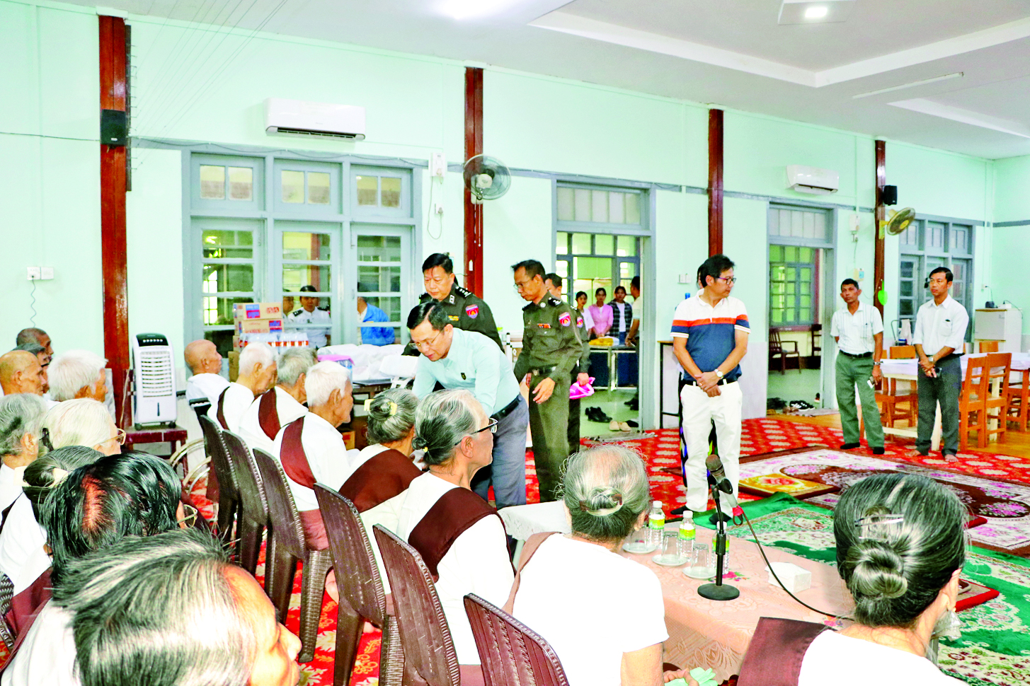 တွေ့ဆုံစဉ် အဘိုးအဘွားများအနေဖြင့် မကြာမီကျင်းပမည့် အထွေထွေရွေးကောက်ပွဲတွင် မဲပေးနိုင်ရေးနှင့် နိုင်ငံသားအခွင့်အရေးမဆုံးရှုံးစေရေးအတွက် နိုင်ငံသားစိစစ်ရေးကတ်ပြားကိုင်ဆောင်ထားရှိမှု၊ နိုင်ငံသားကတ်ပြားပျောက်ဆုံး/ ပျက်စီးပါက မိတ္တူလျှောက်ထား ကိုင်ဆောင်နိုင်ရေး၊ Biographic/ Biometric ကောက်ယူကာ Unique ID နံပါတ်ထုတ်ပေးနေမှု၊ ဆက်လက်ဆောင်ရွက်မည့်အခြေအနေ၊ အဘိုးအဘွားများ၏ နေထိုင်စားသောက်မှုနှင့် ကျန်းမာရေးစောင့်ရှောက်မှုများကို ကြည့်ရှုမေးမြန်းပြီး စားသောက်ဖွယ်ရာများ ပေးအပ်လှူဒါန်းသည်။