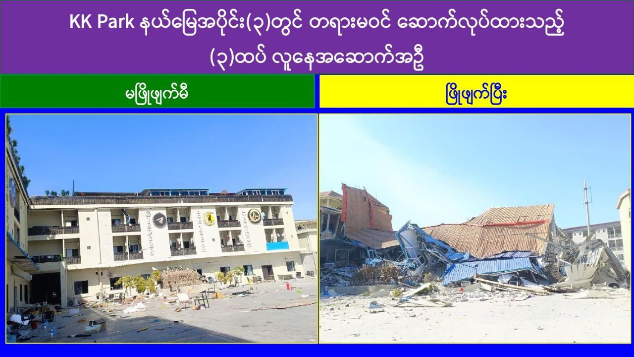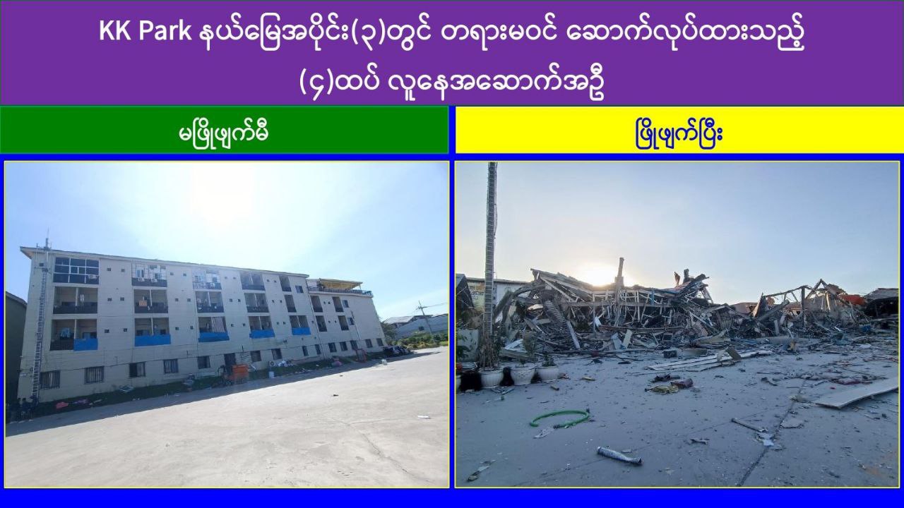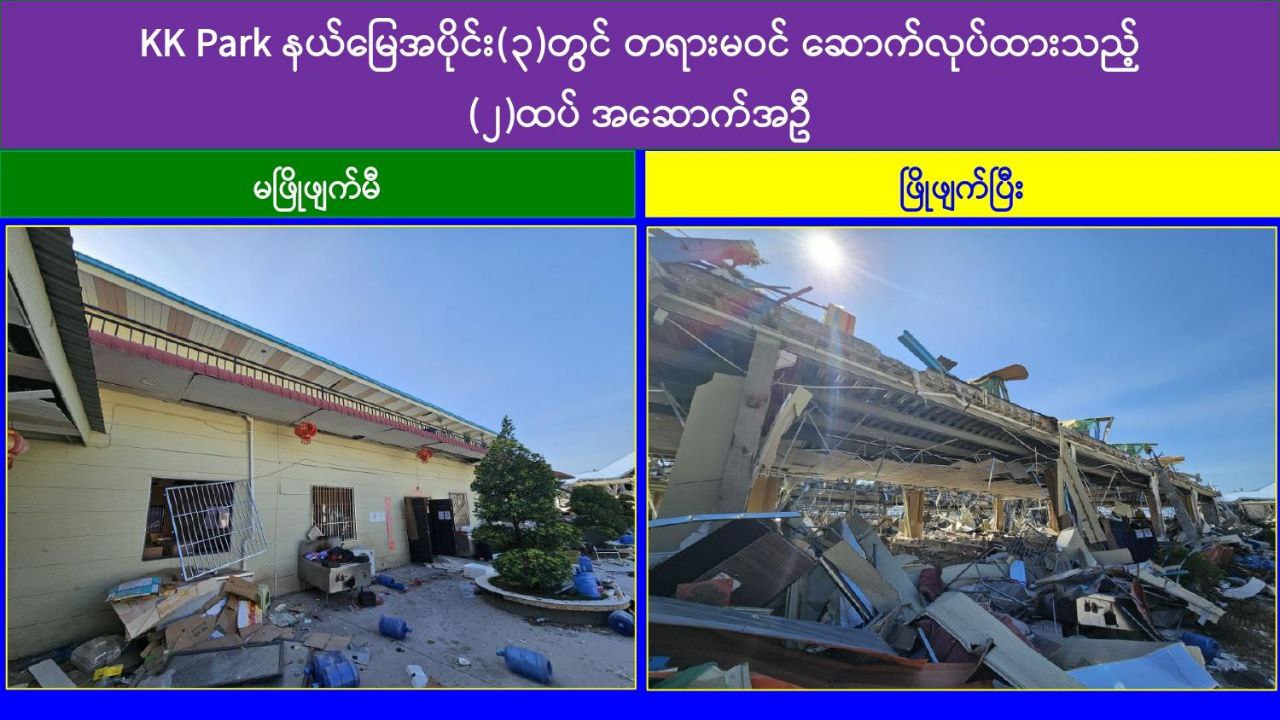 ထိုသို့ အွန်လိုင်းလိမ်လည်မှုများနှင့် အွန်လိုင်းလောင်းကစားမှုတိုက်ဖျက်ရေး လုပ်ငန်းများဆောင်ရွက်ရာတွင် မြဝတီ-မဲထော်သလေး(KK Park)နယ်မြေအတွင်းရှိ အွန်လိုင်းလိမ်လည်လောင်းကစားမှုများကျူးလွန်ရာတွင်အသုံးပြုခဲ့သည့် အဆောက်အအုံများကို အပိုင်း(၃)ပိုင်းခွဲ၍ စနစ်တကျဖြိုချဖျက်ဆီးခြင်းများ ဆောင်ရွက်လျက်ရှိရာ ယနေ့တွင်အပိုင်း (၃) နယ်မြေအတွင်းရှိ တရားမဝင်အဆောက်အအုံ ၇ လုံးကို ထပ်မံဖြိုချဖျက်ဆီးခဲ့သဖြင့် အပိုင်း(၃)နယ်မြေအတွင်းရှိ အဆောက်အအုံ ၄၂၅ လုံးအနက် ယနေ့အထိ ၁၁၅ လုံး ဖြိုချဖျက်ဆီးခဲ့ကြောင်းနှင့် KK Park နယ်မြေအတွင်းရှိ တရားမဝင် အဆောက်အအုံ စုစုပေါင်း ၆၃၅ လုံး အနက် ၂၆၃ လုံးကို ဖြိုချဖျက်ဆီးပြီးဖြစ်ကြောင်းသိရှိရသည်။