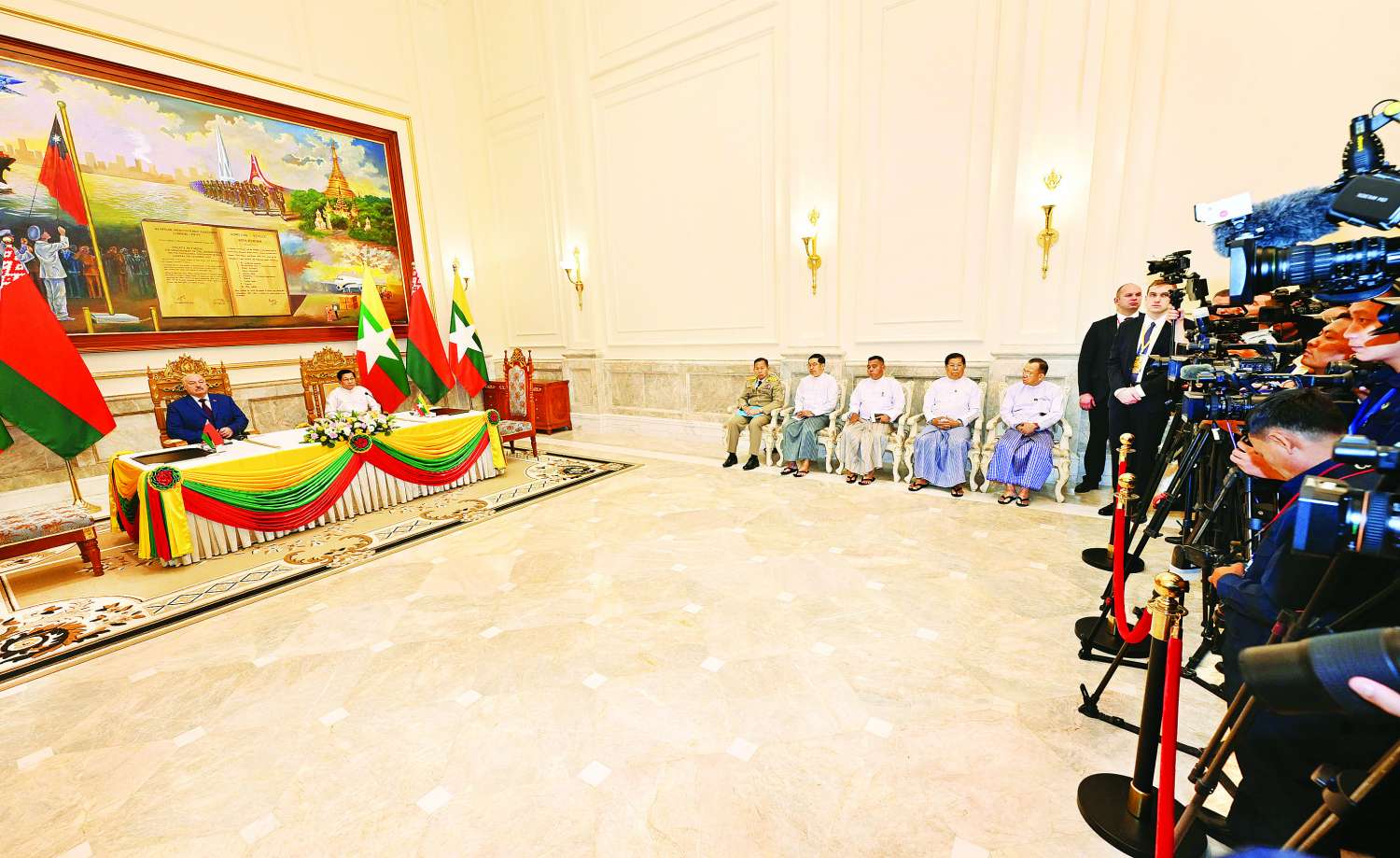 ပြည်ထောင်စုသမ္မတမြန်မာနိုင်ငံတော်ယာယီသမ္မတ နိုင်ငံတော်လုံခြုံရေးနှင့်အေးချမ်းသာယာရေးကော်မရှင်ဥက္ကဋ္ဌ ဗိုလ်ချုပ်မှူးကြီး မင်းအောင်လှိုင်နှင့် ဘယ်လာရုစ်သမ္မတနိုင်ငံသမ္မတ H.E. Mr. Aleksandr Lukashenko တို့သည် ယနေ့နံနက်ပိုင်းတွင် နိုင်ငံတော်သမ္မတအိမ်တော်၌ ကျင်းပသည့် နှစ်နိုင်ငံတွေ့ဆုံဆွေးနွေးပွဲနှင့် နားလည်မှုစာချွှန်လွှာလက်မှတ်ရေးထိုးပွဲအပြီးတွင် နှစ်နိုင်ငံပူးတွဲကြေညာချက်ကို ရှင်းလင်းပြောကြားခဲ့ကြသည်။