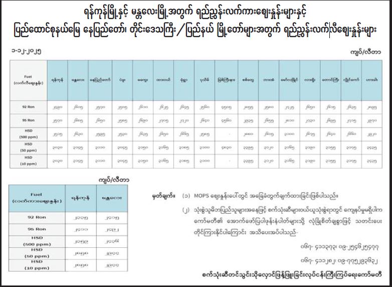 ရန်ကုန်မြို့နှင့် မန္တလေးမြို့အတွက် ရည်ညွှန်းလက်ကားဈေးနှုန်းများနှင့် ပြည်ထောင်စုနယ်မြေ နေပြည်တော်၊ တိုင်းဒေသကြီး/ပြည်နယ် မြို့တော်များအတွက် ရည်ညွှန်းလက်လီဈေးနှုန်းများ 12/01/2025