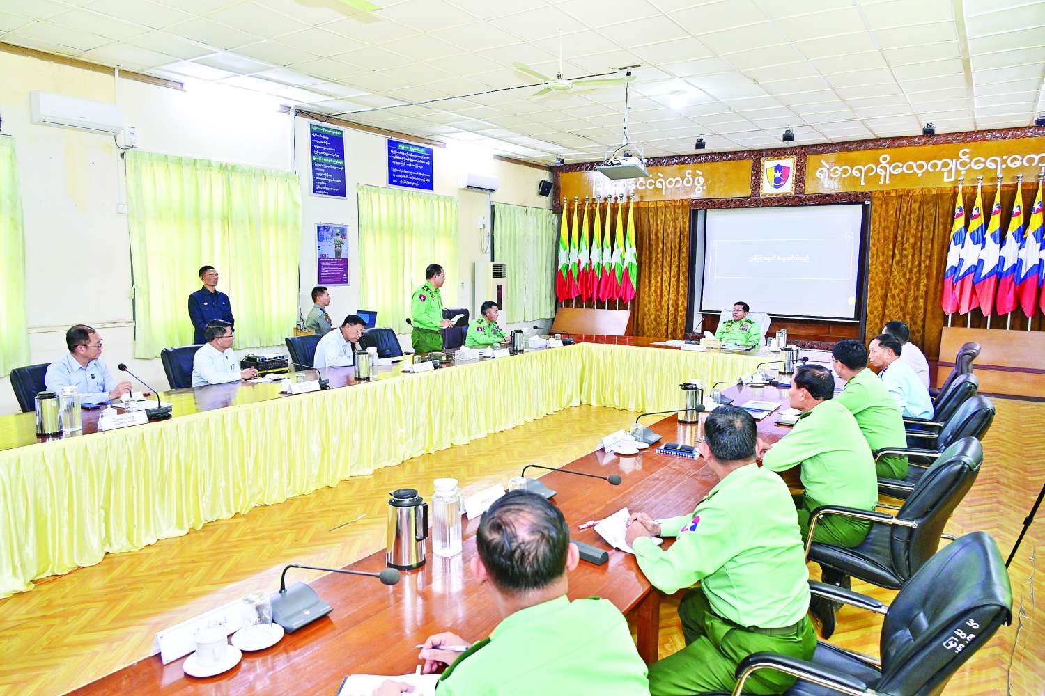 ဆက်လက်ပြီး နိုင်ငံတော်ယာယီသမ္မတ နိုင်ငံတော်လုံခြုံရေးနှင့် အေးချမ်းသာယာရေးကော်မရှင်ဥက္ကဋ္ဌနှင့် အဖွဲ့ဝင်များသည် ရဲအရာရှိလေ့ကျင့်ရေးကျောင်း (ဇီးပင်ကြီး) သို့ရောက်ရှိရာ လေ့ကျင့်ရေးဌာနချုပ်ရုံး အစည်းအဝေးခန်းမ၌ ပြည်ထဲရေးဝန်ကြီးဌာန ပြည်ထောင်စုဝန်ကြီး ဒုတိယဗိုလ်ချုပ်ကြီး ထွန်းထွန်းနောင်က ရဲအရာရှိများအား လေ့ကျင့်ပေးနေသည့်ကျောင်းများနှင့် အခြားအဆင့်ရဲတပ်ဖွဲဝင်များအား လေ့ကျင့်ပေးနေသည့် ကျောင်းများ၏ သမိုင်းအကျဉ်း၊ ဗဟိုမီးသတ်သင်တန်းကျောင်း သမိုင်းအကျဉ်းကို လည်းကောင်း၊ ရဲအရာရှိလေ့ကျင့်ရေးကျောင်း (ဇီးပင်ကြီး) ကျောင်းအုပ်ကြီးနှင့် ဗဟိုမီးသတ်သင်တန်းကျောင်း (ပြင်ဦးလွင်) ကျောင်းအုပ်ကြီးတို့က သင်တန်းကျောင်းဆိုင်ရာ အချက်အလက်များ၊ သင်တန်းများအလိုက် ဖွင့်လှစ်သင်ကြားပေးနိုင်ခဲ့မှု၊ စာပေပညာ၊ စစ်ပညာနှင့် ကြံ့ခိုင်ရေးဘာသာရပ်များသင်ကြားလေ့ကျင့်ပေးလျက်ရှိမှု၊ သင်တန်းကျောင်းများအလိုက် ဝန်ထမ်းများခန့်အပ်ထားရှိမှု၊ စိုက်ပျိုးမွေးမြူရေး လုပ်ငန်းများဆောင်ရွက်ထားရှိမှုနှင့် သက်သာချောင်ချိရေး ဆောင်ရွက်ပေးနိုင်မှု၊ သောက်သုံးရေနှင့် လျှပ်စစ်မီးရရှိမှုအခြေအနေများ၊ သင်တန်းများအလိုက် လက်တွေ့လေ့ကျင့်ခန်းများ ဆောင်ရွက်လျက်ရှိမှုနှင့် လေ့ကျင့်ရေးအဆောက်အအုံများ၊ အထောက်အကူပြုယာဉ်များဆောင်ရွက်ထားရှိမှု အခြေအနေများကိုလည်းကောင်း ရှင်းလင်းတင်ပြကြသည်။