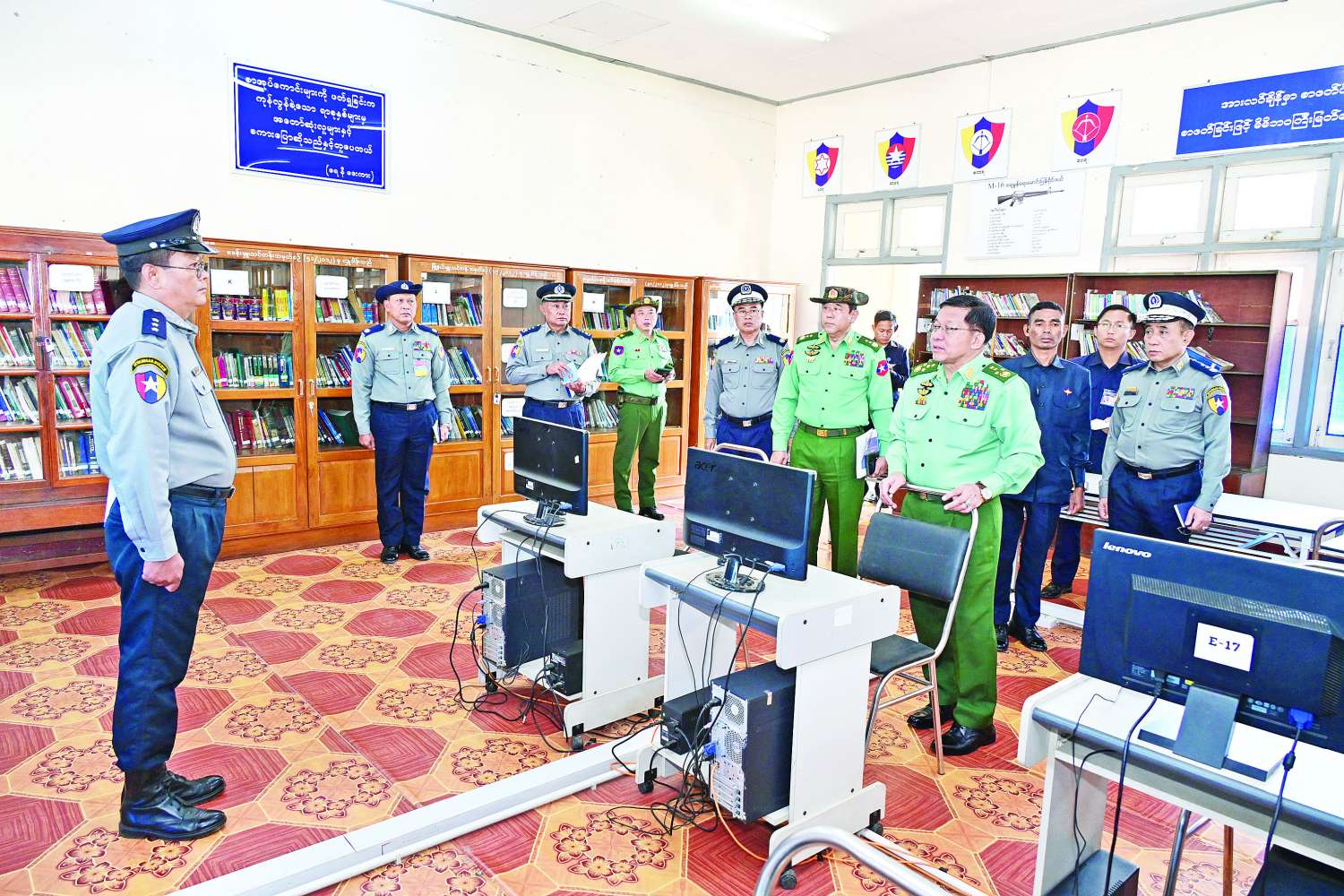 ၎င်းနောက် နိုင်ငံတော်ယာယီသမ္မတ နိုင်ငံတော်လုံခြုံရေးနှင့်အေးချမ်းသာယာရေးကော်မရှင်ဥက္ကဋ္ဌနှင့် အဖွဲ့ဝင်များသည် သင်တန်းကျောင်းစာကြည့်တိုက်အတွင်း လှည့်လည်ကြည့်ရှုစစ်ဆေးပြီး တာဝန်ရှိသူများ၏ တင်ပြချက်များအပေါ် သင်တန်းသားများ ဗဟုသုတိုးပွားစေရေးအတွက် စာအုပ်စာစောင်များဖတ်ရှုစေရေး ဆောင်ရွက်ပေးရန်လိုကြောင်း၊ စာကြည့်တိုက်တွင်း စာအုပ်များစနစ်တကျထားရှိရန်နှင့် သုတ၊ ရသ စာအုပ်စာစောင်များကိုလည်း ထပ်မံဖြည့်ဆည်းဆောင်ရွက်သွားရန်လိုကြောင်းနှင့် အခြားလိုအပ်သည်များကို လမ်းညွှန်မှာကြားသည်။
