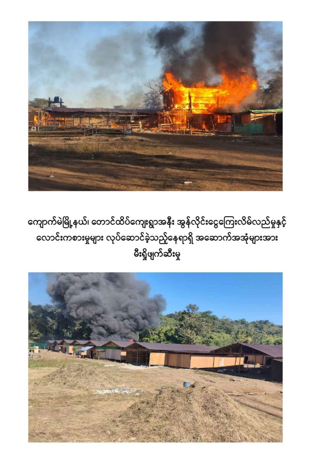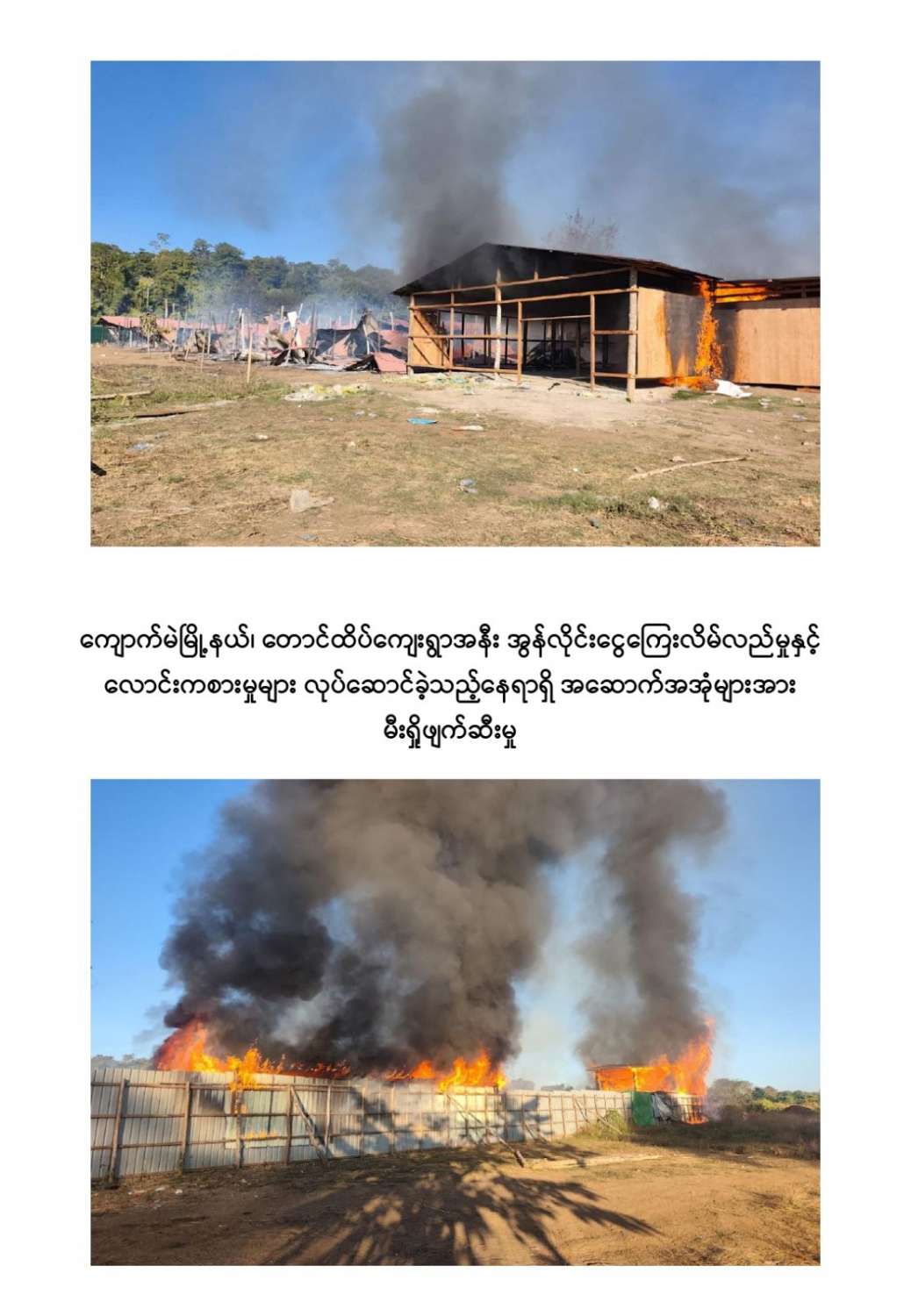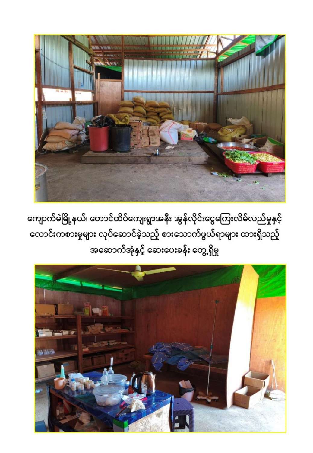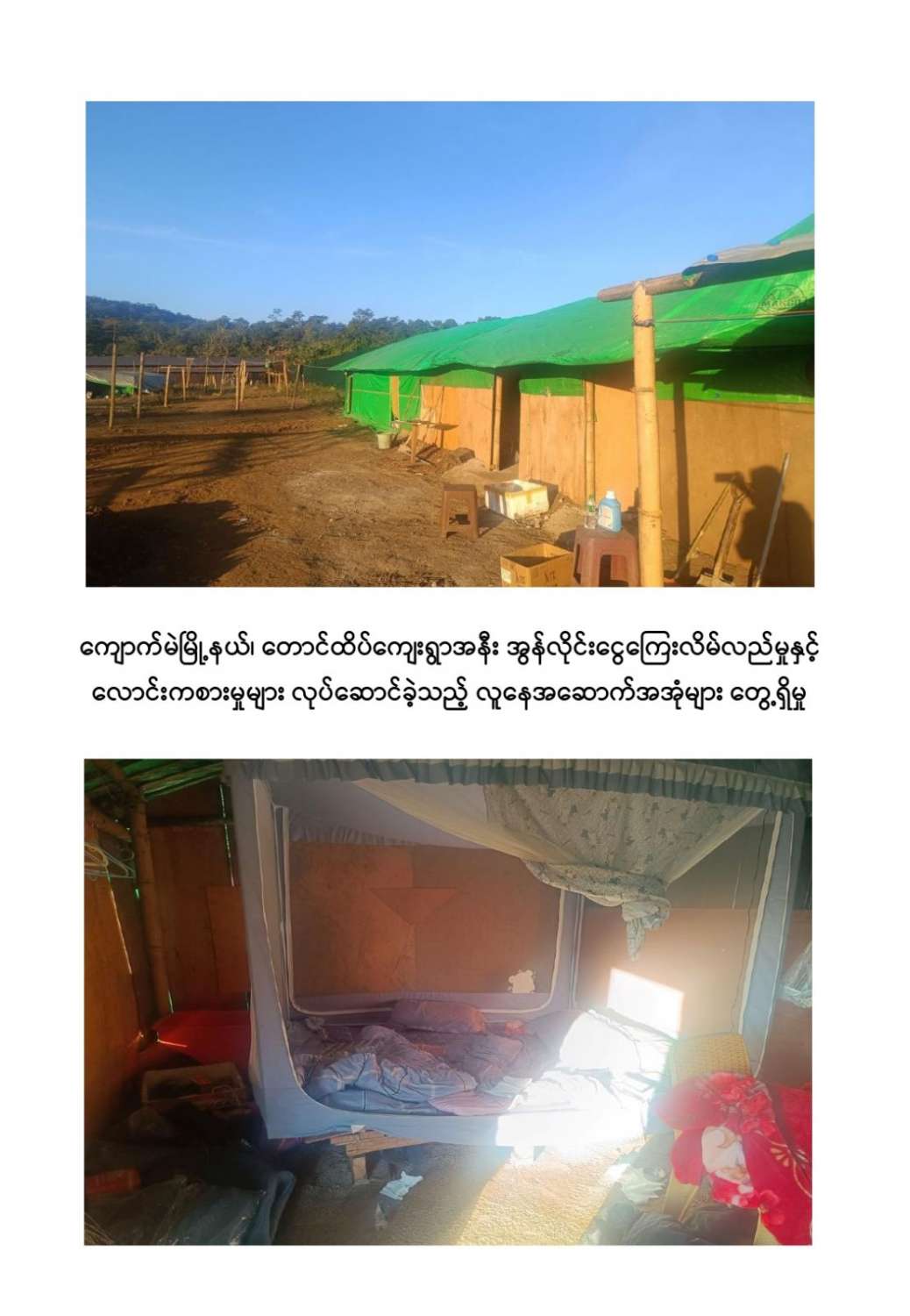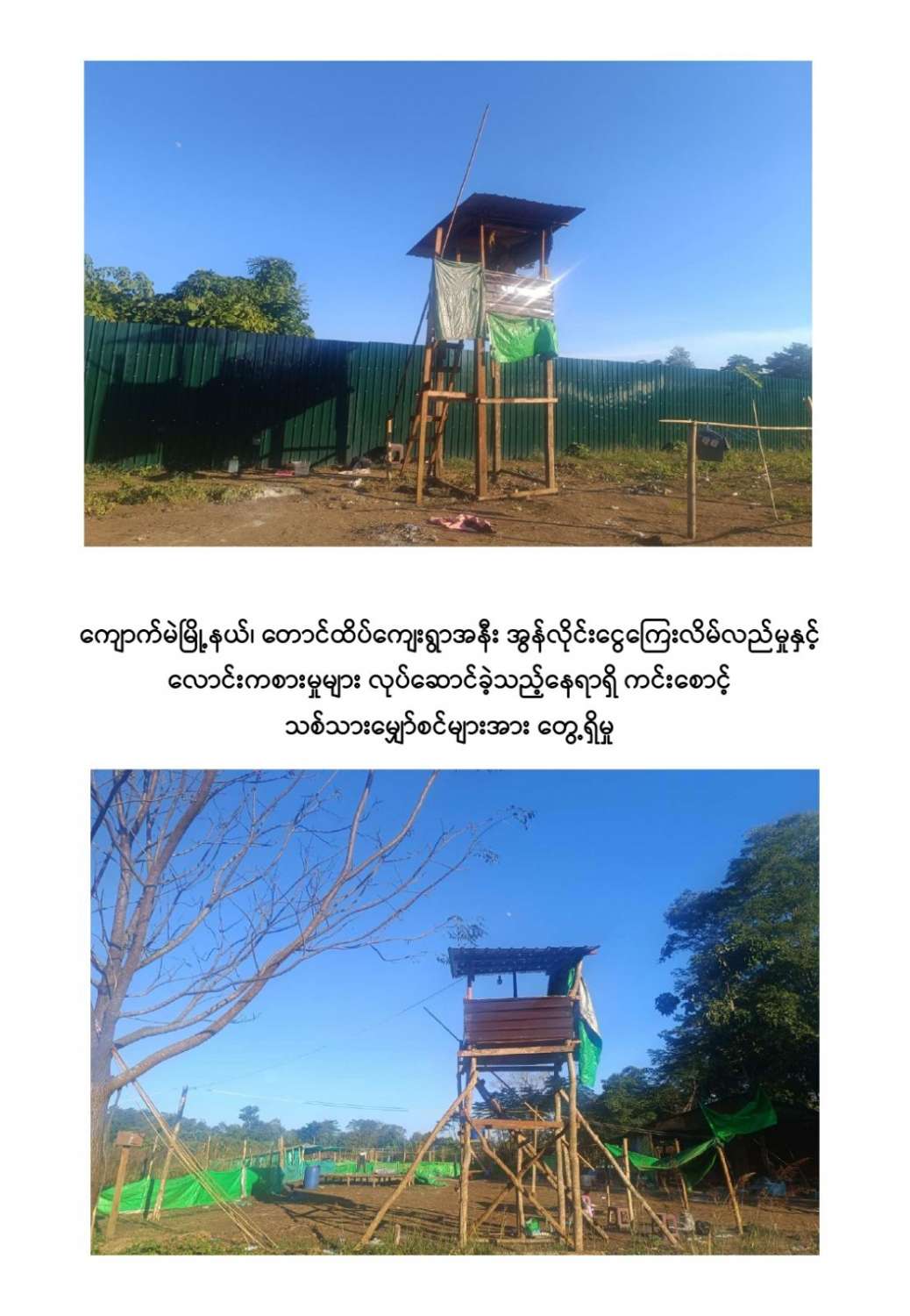 ကျောက်မဲမြို့နယ်အတွင်း နယ်မြေလုံခြုံရေးဆောင်ရွက်နေသည့် လုံခြုံရေးတပ်ဖွဲ့ဝင်များသည် နိုဝင်ဘာ ၃၀ ရက်တွင် ကျောက်မဲမြို့နယ်၊ တောင်ထိပ်ကျေးရွာ၏တောင်ဘက် ဒုဋ္ဌဝတီမြစ်အနီးသို့ရောက်ရှိစဉ် မသင်္ကာဖွယ်ရာအဆောက်အအုံများကိုတွေ့ရှိရသဖြင့် ဝင်ရောက်ရှာဖွေစစ်ဆေးခဲ့ရာ အွန်လိုင်းငွေကြေးလိမ်လည်မှုနှင့် လောင်းကစားမှုများ လုပ်ဆောင်နေသည့်နေရာဖြစ်ကြောင်းတွေ့ရှိရပြီး လုပ်ငန်းလုပ်ကိုင်နေကြသူများအား မတွေ့ရှိရဘဲ အလျား ၆၀ ပေ၊ အနံ ၃၀ ပေ ရှိ သွပ်မိုး ၃ ထပ်သားကာ အိပ်ဆောင် ၆ လုံး၊ အလျား ၆၀ ပေ၊ အနံ ၃၀ ပေ ရှိ သွပ်မိုး ၃ ထပ်သားကာ လုပ်ငန်းဆောင် ၅ လုံး၊ အလျား ၆၀ ပေ၊ အနံ ၃၀ ပေ ရှိ သွပ်မိုး ၃ ထပ်သားကာ အစားအစာသိုလှောင်ရုံ ၆ လုံး၊ အလျား ၆၀ ပေ၊ အနံ ၃၀ ပေ ရှိ ဆောက်လုပ်ဆဲလုပ်ငန်းဆောင် ၁ လုံး၊ အလျား ၆၀ ပေ၊ အနံ ၃၀ ပေ ရှိ ဆောက်လုပ်ဆဲအိပ်ဆောင် ၁ လုံး၊ အလျား ၈၀ ပေ၊ အနံ ၁၅ ပေ ရှိအထွေထွေသုံးအဆောင် ၁ လုံး၊ အလျား ၈၀ ပေ၊ အနံ ၁၀ ပေ ရှိ ၃ထပ်သားကာ တန်းလျားရှည်အိမ်သာ အိမ်သာ ၁ လုံး၊ အလျား ၃၀ ပေ၊ အနံ ၁၀ ပေ ရှိ အိပ်ခန်းတွဲ ၄ ခန်းတွဲအိပ်ဆောင် ၁ လုံး၊ အိပ်ခန်း ၄ ခန်းတွဲ(ရိက္ခာစတိုပါ) နှစ်ထပ်ဆောင် ၁ လုံး၊ မီးစက်အကြီး ၁ လုံး၊ ၁၅ ပေအမြင့် ကင်းစောင့် သစ်သား မျှော်စင် ၅ လုံး၊ အလျား ၂၀ ပေ၊ အနံ ၁၀ ပေ၊ အိပ်ဆောင်တန်းလျား ၁ လုံး၊ အလျား ၇၀၀ ပေ၊ အနံ ၄၀၀ ပေ၊ သွပ်ကာခြံဝန်း ၁ ခု၊ ALL IN ONE DESKTOP ကွန်ပျူတာ ၃၀ လုံး၊ STAR LINK ဗန်း ၁၀ ခု AIR COOLER ၁ လုံး၊ XIAOMI ဝိုင်ဖိုင်စက် ၂ လုံး၊ SOUND BOX ၁ လုံး၊ POWER STATION ၃ လုံး၊ ငွေရေတွက်စက် ၁ လုံး၊ ငွေကဒ်ဖြတ်စက် ၃ လုံး၊ ကွန်ပျူတာ ဆက်စပ်ပစ္စည်းများနှင့် အခြားလျှပ်စစ်သုံးပစ္စည်းများကို တွေ့ရှိသိမ်းဆည်းရမိခဲ့ကြောင်း သိရှိရသည်။