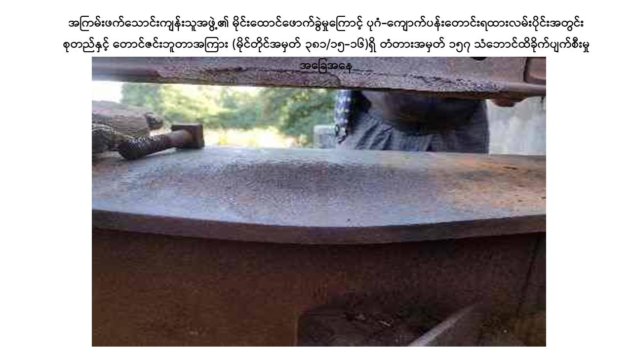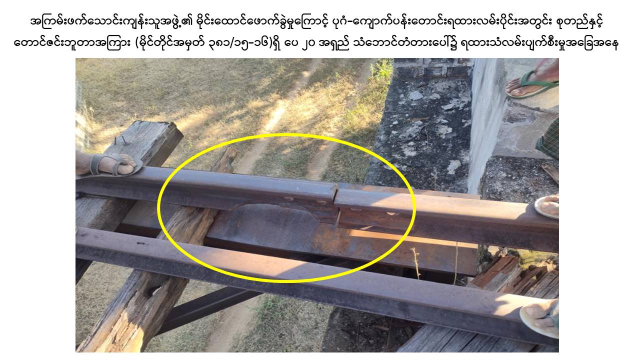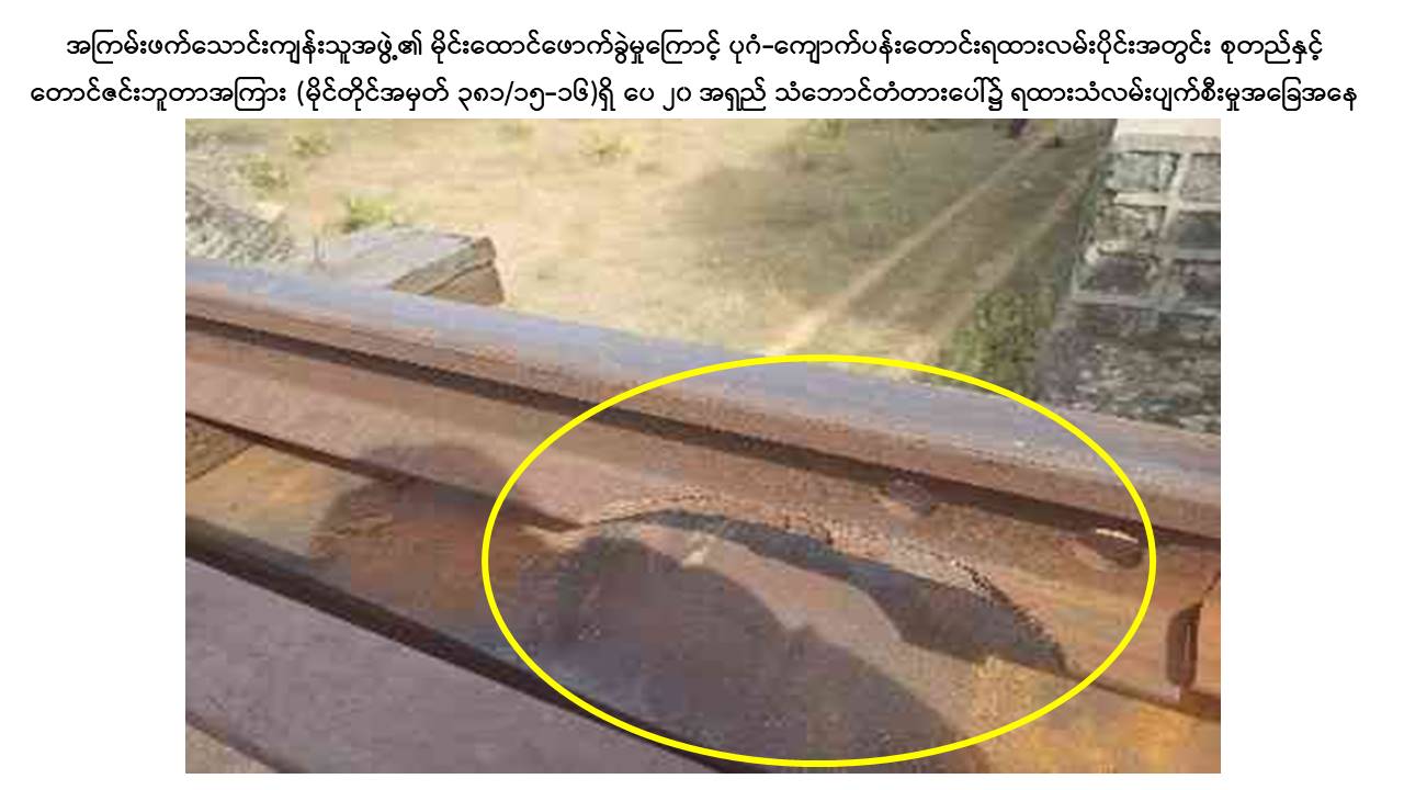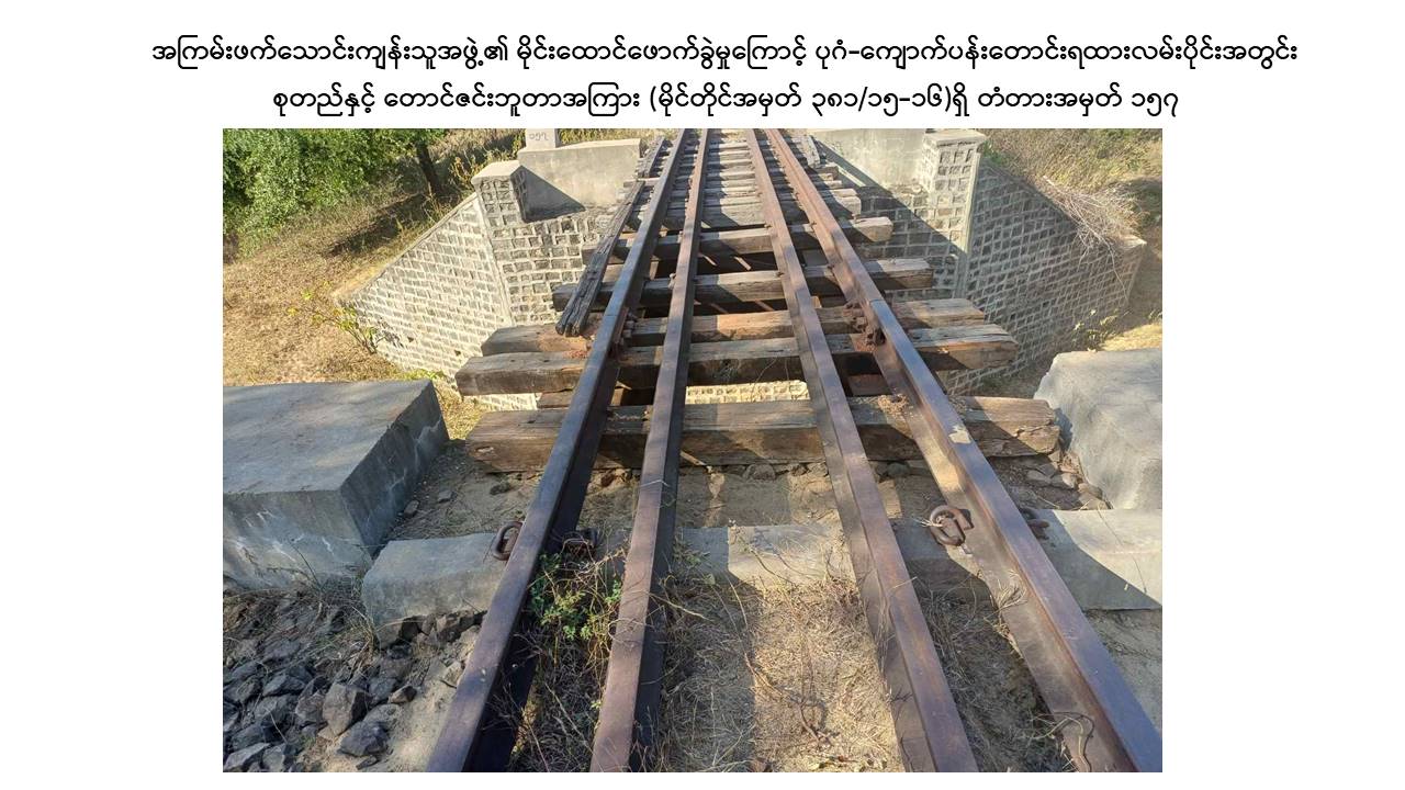 မန္တလေးတိုင်းဒေသကြီး၊ ညောင်ဦးမြို့နယ်၊ ပုဂံ-ကျောက်ပန်းတောင်းလမ်းပိုင်းအတွင်း စုတည်ဘူတာနှင့် တောင်ဇင်းဘူတာအကြား သံလမ်းပြေးယာဉ် RGC 103 ဖြင့် ရထားလမ်းပိုင်းအား ယနေ့နံနက် ၈ နာရီ ၅၀ မိနစ်ခန့်တွင် သွားရောက်စစ်ဆေးစဉ် မိုင်တိုင် ၃၈၁/၁၅-၁၆ ကြား ပေ ၂၀ အရှည်ရှိ သံဘောင်တံတားအမှတ် ၁၅၇ အနီးတွင် အကြမ်းဖက်သောင်းကျန်းသူအဖွဲ့က မိုင်းထောင်ဖောက်ခွဲဖျက်ဆီးခဲ့သဖြင့် ရထားသံလမ်းအရှေ့ဘက်ခြမ်း သံလမ်းဖိနပ် ၁ ပေခန့် ပဲ့ထွက်ပျက်စီးခြင်းနှင့် ဇလီဖား(၃)တုံး ကျိုးပဲ့နေကြောင်းတွေ့ရှိရသဖြင့် စုတည်-တောင်ဇင်း ရထားလမ်းပိုင်းအား နံနက် ၁၀ နာရီ ၁၆ မိနစ်ခန့်တွင် ယာယီပိတ်ထားခဲ့ကြောင်း သိရှိရသည်။