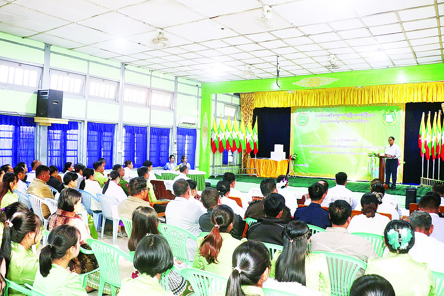 သမဝါယမနှင့် ကျေးလက်ဖွံ့ဖြိုးရေးဝန်ကြီးဌာန အသေးစားစက်မှုလက်မှုလုပ်ငန်းဦးစီးဌာနမှ အကောင်အထည်ဖော် ဆောင်ရွက်လျက်ရှိသည့် “အသေးစား ကုန်ထုတ်လုပ်ငန်းများ ဖန်တီးပေးနိုင်ရေးနှင့် ကျေးလက်နေမိသားစုဝင်ငွေတိုးရေး” စီမံကိန်းလုပ်ငန်းသုံးပစ္စည်းများနှင့် သင်တန်းဆင်းလက်မှတ် များပေးအပ်ပွဲကို ယနေ့နံနက်ပိုင်းက နေပြည်တော်ကောင်စီနယ်မြေ တပ်ကုန်းမြို့ အထွေထွေအုပ်ချုပ်ရေးဦးစီးဌာန အစည်းအဝေးခန်းမ၌ကျင်းပရာ သမဝါယမနှင့် ကျေးလက်ဖွံ့ဖြိုးရေးဝန်ကြီးဌာန ပြည်ထောင်စုဝန်ကြီး ဦးလှမိုး၊ ဒုတိယဝန်ကြီး ဦးသိုက်စိုး၊ နေပြည်တော်ကောင်စီဝင်များနှင့် တာဝန်ရှိသူများ တက်ရောက်ကြသည်။