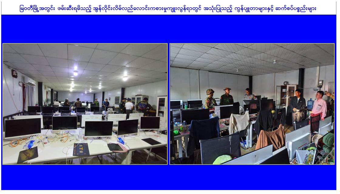 အွန်လိုင်းလောင်းကစားမှုများ၊ အွန်လိုင်းလိမ်လည်မှုများအပါအဝင် ဒုစရိုက်မှုများ ကျူးလွန်ခဲ့ကြသူများအား အင်တိုက်အားတိုက်ဖြင့် ကျယ်ကျယ်ပြန့်ပြန့် ရှာဖွေဖမ်းဆီး အရေးယူခြင်းများ ဆောင်ရွက်လျက်ရှိရာ ယနေ့တွင် မြဝတီမြို့ရှိ လုံခြုံရေးပူးပေါင်းအဖွဲ့များက သတင်းအရ မြဝတီမြို့ဝန်းကျင်တွင် ရှောင်တခင်စစ်ဆေးခြင်းများ ဆောင်ရွက်ခဲ့ရာ အမှတ်(၃) ရပ်ကွက်တွင် တရားမဝင်အွန်လိုင်းလောင်းကစားမှုများ၊ အွန်လိုင်းလိမ်လည်မှုများ ကျူးလွန်လျက်ရှိကြသည့် တရုတ်နိုင်ငံသား ၂၅ ဦး၊ မြန်မာနိုင်ငံသား ၂၂၃ ဦး စုစုပေါင်း ၂၄၈ ဦးအား တရားမဝင်အွန်လိုင်းလောင်းကစားနှင့် ငွေကြေးလိမ်လည်မှုများတွင် အသုံးပြုသည့် ကွန်ပျူတာမျိုးစုံ ၈၂ လုံး၊ မိုဘိုင်းဖုန်း ၉၂ လုံးနှင့် ဆက်စပ်ပစ္စည်းများနှင့်အတူ ဖမ်းဆီးရမိခဲ့ပြီး အဆိုပါဖမ်းဆီးရမိသူများအား ဥပဒေလုပ်ထုံးလုပ်နည်းများနှင့်အညီ စနစ်တကျ အရေးယူဆောင်ရွက်သွားမည်ဖြစ်သည်။ ထို့ပြင် အွန်လိုင်းလိမ်လည်မှုနှင့် လောင်းကစားမှုလုပ်ငန်းများ နေထိုင်လုပ်ကိုင်ခဲ့ကြသည့် ၃ ထပ် အဆောက်အအုံ ၅ လုံး၊ ၁ ထပ် အဆောက်အအုံ ၃ လုံး၊ စုစုပေါင်း ၈ လုံးတို့အား စစ်ဆေးတွေ့ရှိခဲ့ရပြီး ပြန်လည်အသုံးချမှုမရှိစေရေးအတွက် ၃ ထပ်အဆောက်အအုံ ၁ လုံးကို ယနေ့တွင် စတင်၍ စနစ်တကျ ဖြိုချဖျက်ဆီးခဲ့ကြောင်း သိရှိရသည်။