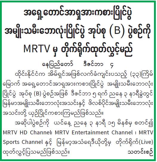 အရှေ့တောင်အာရှအားကစားပြိုင်ပွဲ အမျိုးသမီးဘောလုံးပြိုင်ပွဲ အုပ်စု (B) ပွဲစဉ်ကို MRTV မှ တိုက်ရိုက်ထုတ်လွှင့်မည် 12/05/2025