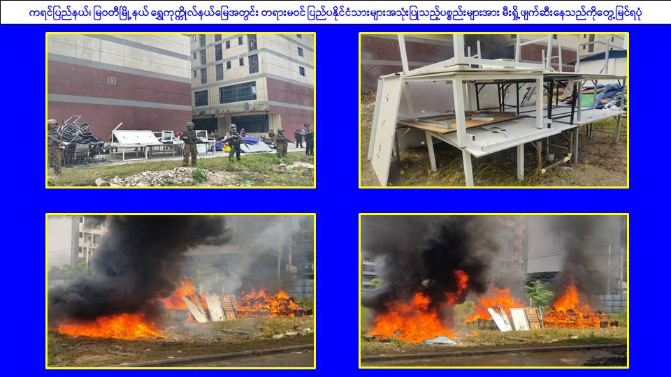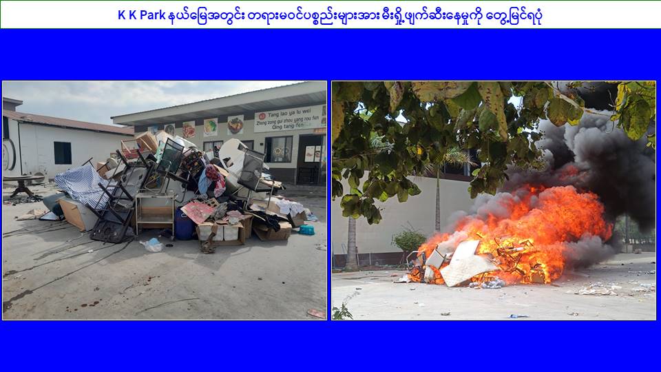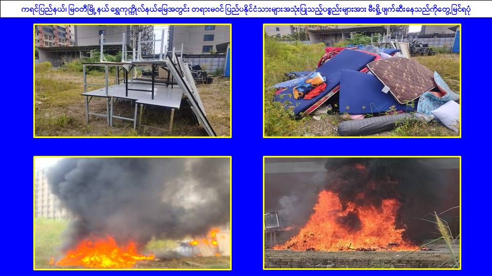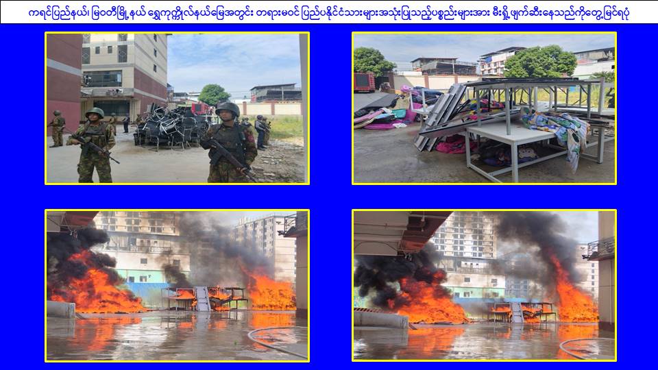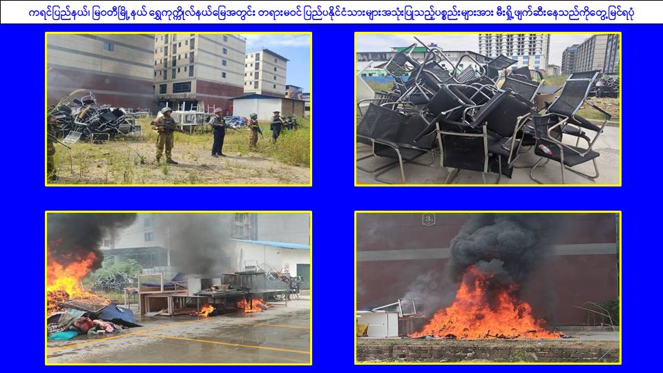၎င်းအပြင် မြဝတီမြို့နယ်အတွင်းရှိ KK Park နယ်မြေနှင့် ရွှေကုက္ကိုလ်နယ်မြေတို့၌ အွန်လိုင်းလိမ်လည်လောင်းကစားမှုကျူးလွန်ရာတွင် အသုံးပြုသည့်ပစ္စည်းများအား ထပ်မံ၍ အသုံးပြုနိုင်ခြင်းမရှိစေရန်အတွက် ယနေ့တွင်လည်း စနစ်တကျမီးရှို့ဖျက်ဆီးခဲ့ကြောင်း သိရှိရသည်။