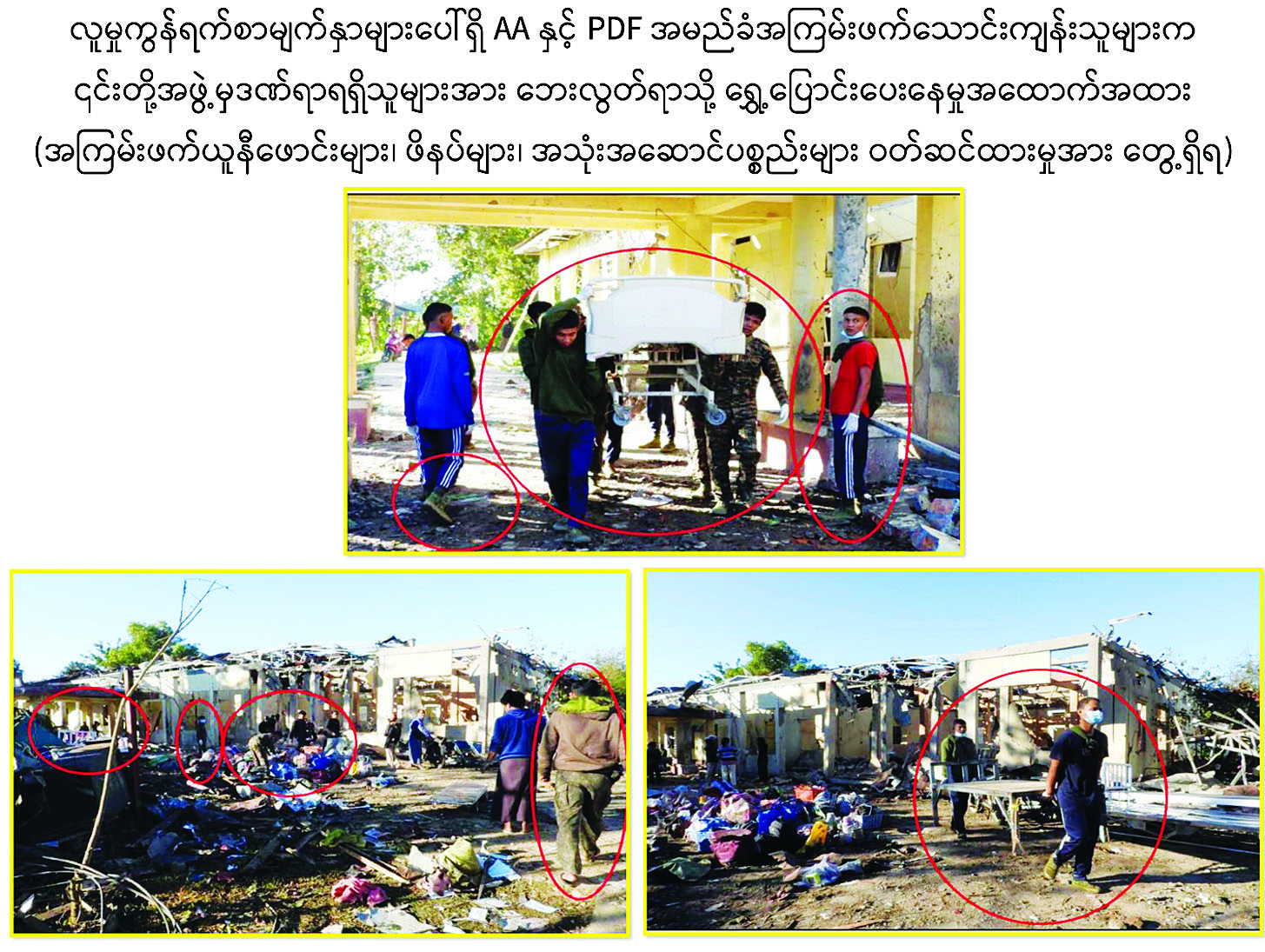 လူမှုကွန်ရက်စာမျက်နှာများပေါ်ရှိ ၎င်းအကြမ်းဖက်သောင်းကျန်းသူများ ရေးသားဖြန့်ဝေထားသည့် ဓာတ်ပုံအထောက်အထားများအရ ၎င်းတို့အဖွဲ့မှ ဒဏ်ရာရရှိသူများအား ဘေးလွတ်ရာသို့ ရွှေ့ပြောင်းပေးနေမှု၊ သေဆုံးသူများအတွက် ဝမ်းနည်းကြောင်း ရေးသားဖော်ပြမှုများကို တွေ့ရှိ ရပြီး အထက်ပါဖြစ်စဉ်တွင် သေဆုံး၊ ဒဏ်ရာရရှိ သူများမှာ ပြည်သူများမဟုတ်ဘဲ AA ၊ BPLA ၊ ဒေသခံ PDF၊ အရှိုချင်း စသည့် အကြမ်းဖက်သောင်းကျန်းသူများအနေဖြင့် စစ်စခန်းအဖြစ် အခြေပြုနေသောနေရာအတွင်း လိုအပ်သော အုပ်ချုပ်မှုကိစ္စရပ်များ ဆောင်ရွက်ရန်အတွက် ဒေသခံ AA အကြမ်းဖက်သောင်းကျန်းသူများ၏ ယုံကြည်စိတ်ချရသော မိသားစုဝင်များကို တာဝန် ပေးထားသူများအပြင် ၎င်းတို့ကိုထောက်ခံအားပေးသည့် အမာခံများသာဖြစ်သည်ဟု သိရှိရကြောင်းနှင့် တပ်မတော်အနေဖြင့် လိုအပ်သည့်အကြမ်းဖက် ချေမှုန်းရေးစစ်ဆင်ရေးကို (Rules of Engagement- ROE)နှင့်အညီ လိုအပ်သလို ဆက်လက်ဆောင်ရွက်သွားမည်ဖြစ်ကြောင်း သတင်းထုတ်ပြန်အပ်ပါသည်။