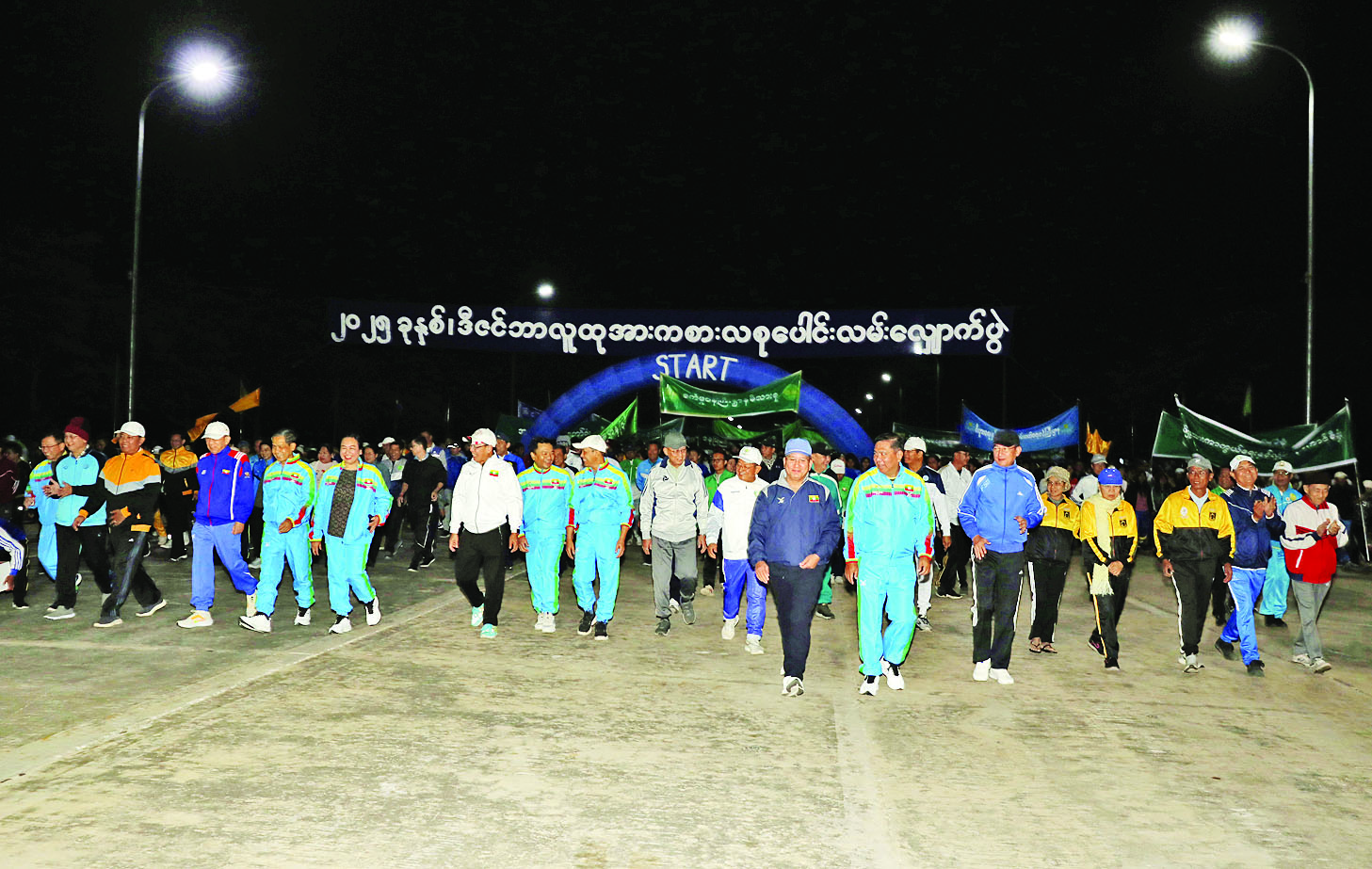 ဦးစွာ စုပေါင်းလမ်းလျှောက်ပွဲကို အားကစားနှင့်လူငယ်ရေးရာဝန်ကြီးဌာန ဒုတိယဝန်ကြီး ဦးထိန်လင်းက သေနတ်ပစ်ဖောက်၍ တာလွှတ်ပေးရာ ပါဝင်ဆင်နွှဲကြသူများသည် ဝဏ္ဏသိဒ္ဓိအားကစားကွင်း၏ သတ်မှတ်လမ်းကြောင်းများအတိုင်း တပျော်တပါး စုပေါင်းလမ်းလျှောက်ကြသည်။