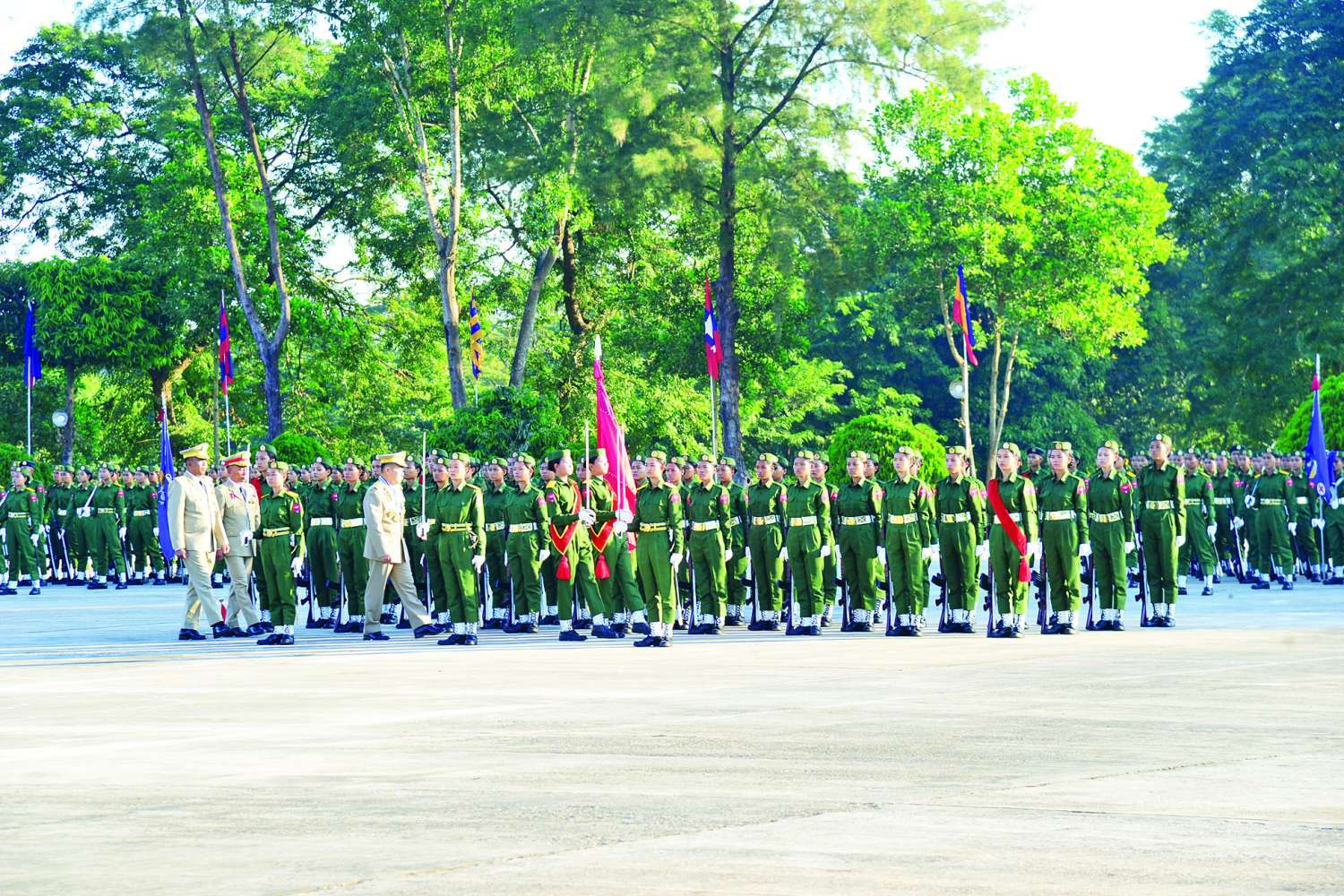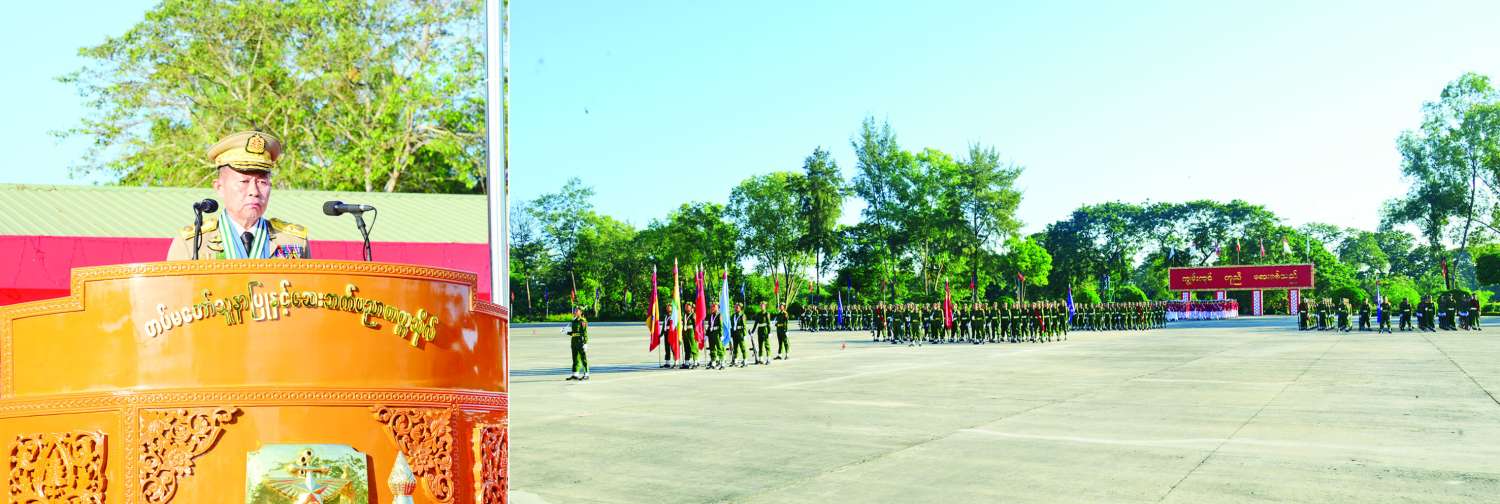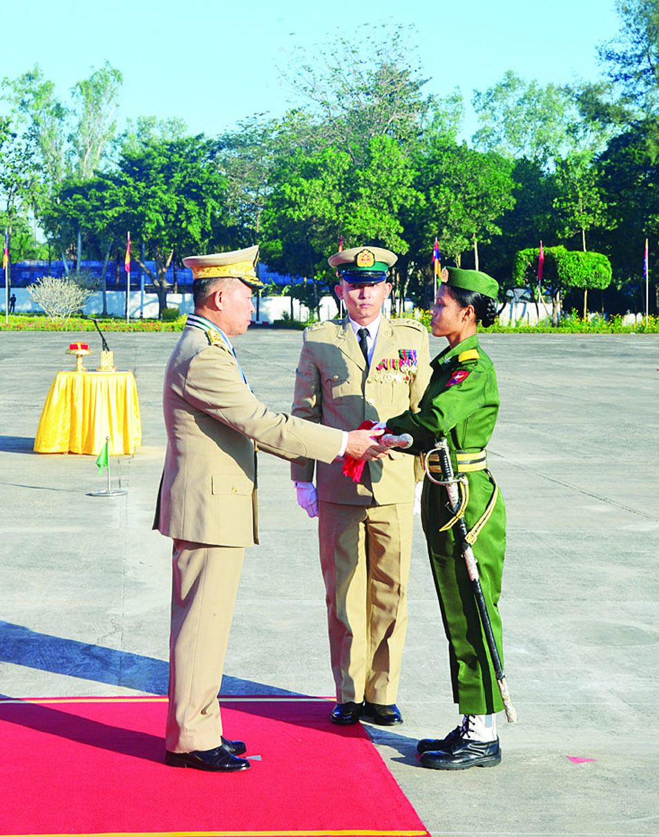 ဦးစွာ နိုင်ငံတော်လုံခြုံရေးနှင့် အေးချမ်းသာယာရေးကော်မရှင် ဒုတိယဥက္ကဋ္ဌ ဒုတိယတပ်မတော်ကာကွယ်ရေးဦးစီးချုပ်၊ ကာကွယ်ရေးဦးစီးချုပ် (ကြည်း) ဒုတိယဗိုလ်ချုပ်မှူးကြီး သီရိပျံချီ မဟာသရေစည်သူ စိုးဝင်းက သင်တန်းဆင်းတပ်ခွဲများ၏ အလေးပြုခြင်းကို ခံယူပြီး အလံတော်အဖွဲ့နှင့် ကျောင်းဆင်းတပ်ခွဲများအား စစ်ဆေးသည်။ ထို့နောက် ဒုတိယတပ်မတော်ကာကွယ်ရေးဦးစီးချုပ်အား ကျောင်းဆင်းတပ်ခွဲများက အနှေးလျှောက်၊ အမြန်လျှောက်ဖြင့် ချီတက်အလေးပြုကြသည်။