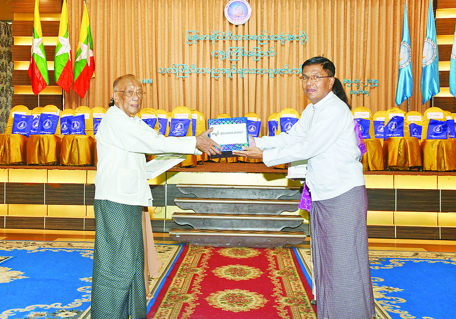 ဦးစွာ ဒုတိယဝန်ကြီး ဦးရဲတင့်နှင့် တိုင်းဒေသကြီး လူမှုရေးရာဝန်ကြီး ဦး​ဌေး​အောင်တို့က မုဒိတာစကားပြောကြားကြသည်။