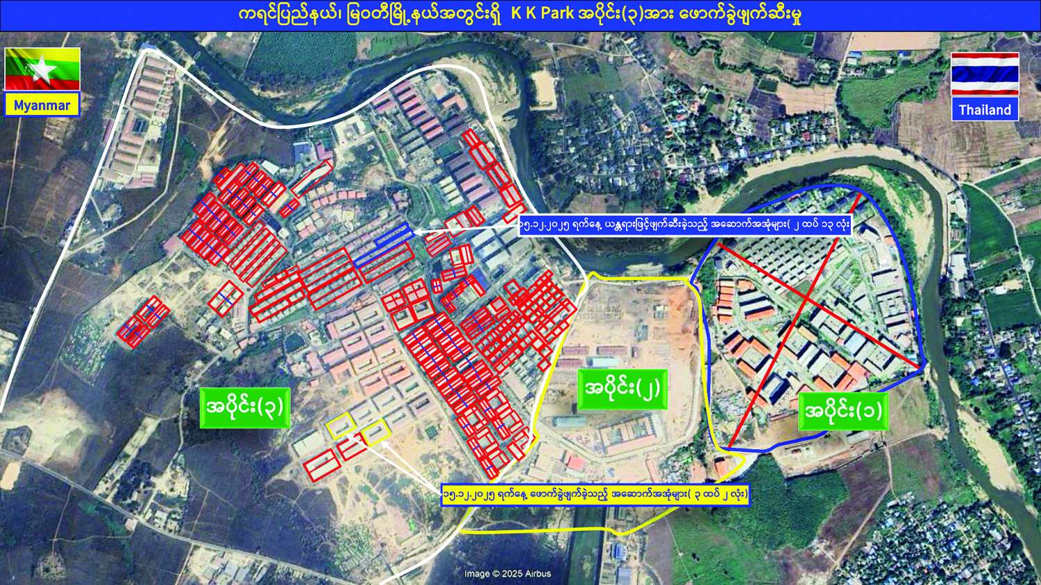 KK Park နယ်မြေအတွင်းရှိ အွန်လိုင်းလိမ်လည်လောင်းကစားမှုကျူးလွန်ရာတွင် အသုံးပြုသည့် အဆောက်အအုံ ၁၅ လုံး ထပ်မံဖြိုချဖျက်ဆီး၊ မြဝတီမြို့အတွင်း အွန်လိုင်းလိမ်လည်လောင်းကစားမှုကျူးလွန်သူများမရှိစေရေး ဆက်လက်ရှာဖွေစစ်ဆေး