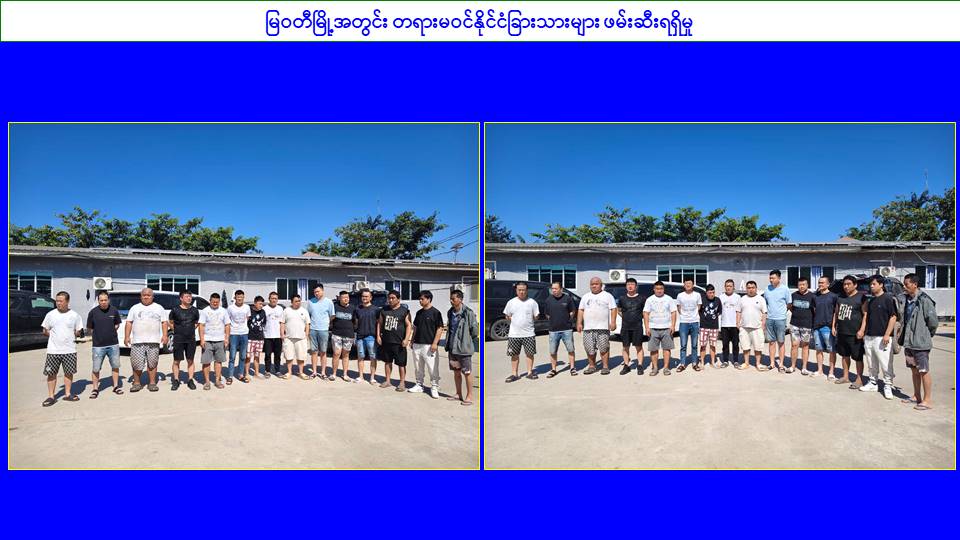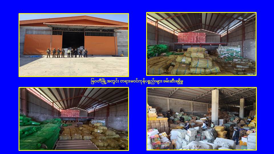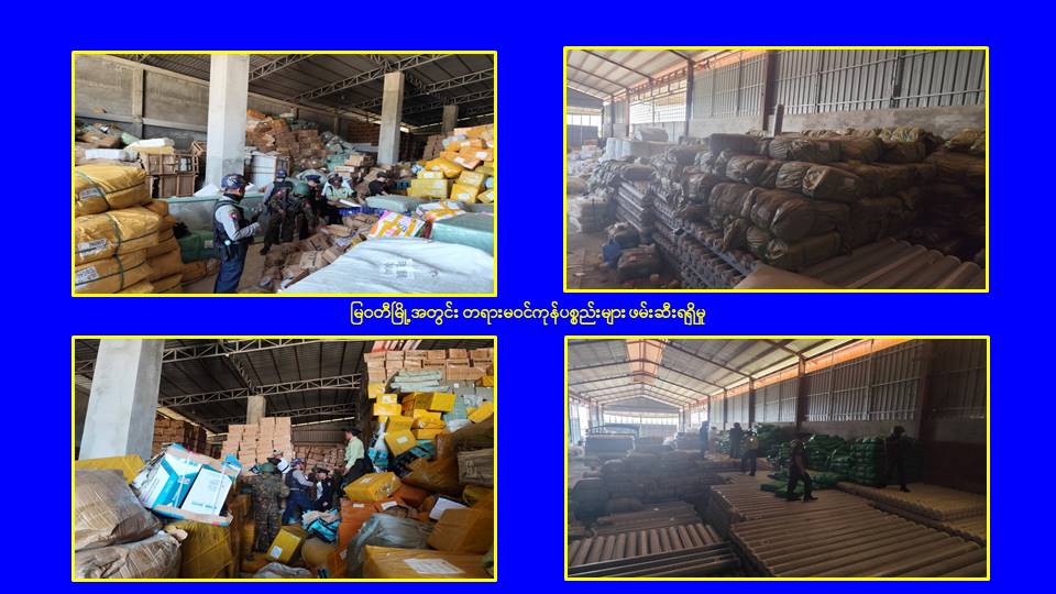 ထို့ပြင် မြဝတီမြို့အတွင်း၌လည်း တရားမဝင် ဝင်ရောက်နေထိုင်သူများနှင့် အွန်လိုင်းလောင်းကစားကျူးလွန်သူများအား ဖမ်းဆီးရမိရေးလုံခြုံရေးပူးပေါင်းအဖွဲ့များက သတင်းအရ မြဝတီမြို့ဝန်းကျင်တွင် ရှောင်တခင်စစ်ဆေးခြင်းများ၊ မြဝတီမြို့အဝင်/အထွက် လမ်းကြောင်းနေရာများနှင့် လမ်းဆုံလမ်းခွနေရာများတွင် ပိတ်ဆို့စစ်ဆေးရှာဖွေရှင်းလင်းခြင်းများ ဆောင်ရွက်ခဲ့ရာ ယနေ့တွင်လည်း တရားမဝင်အဆောက်အအုံ ၅ လုံးအား ထပ်မံစစ်ဆေးနိုင်ခဲ့ပြီး အဆိုပါအဆောက်အုံများအနက်မှ မြဝတီမြို့၊ မြေနီကုန်းရပ်ကွက်အနီး လူမနေပိတ်ထားသည့် တည်းခိုခန်းအတွင်း၌ တရားမဝင်တရုတ်နိုင်ငံသား အမျိုးသား ၁၅ ဦးအားလည်းကောင်း၊ ဂိုထောင် ၂ လုံးအတွင်း၌ တရားမဝင်ကုန်ပစ္စည်းများဖြစ်သော ကားကြီးတာယာ (ဆိုဒ် TX ၆၀) ၂၀၀ လုံး၊ မိုးကာလိပ်အစိမ်း ၃၀၀၀ လိပ်၊ စက္ကူလိပ် (အကြီး) ၂၀ လိပ်၊ Air Fiter ဘူး (အကြီး) ၂၀ လုံး၊ Air Fiter ဘူး (အသေး) ၃၀ လုံး၊ Battery စက်ဘီး ၁၆ စီး၊ ရေစုပ်မော်တာ (၁ . ၅ ကောင်) ၁၀၀ လုံး၊ Back Hoe ဘီးခွေ ၂၅ ခု၊ တစ်ရှူးဖာမျိုးစုံ ၃၀၀၀ ဖာ၊ စာရေးကိရိယာမျိုးစုံ ၁၀၀၀ ဖာ၊ အလှကုန်ပစ္စည်း ၂၅၀ ထုပ်၊ သွပ်ဖာဆီလီကွန် ၁၈၀၀ ဖာ၊ စက်ဘီး ၂၀ စီး၊ကလေးတွန်းလှည်း ၁၅ ခု၊ စုစုပေါင်း တရားမဝင်ကုန်ပစ္စည်း ၁၄ မျိုးအားလည်းကောင်း သိုလှောင်ထားရှိကြောင်း ဖော်ထုတ်ဖမ်းဆီးရမိခဲ့သည်။
