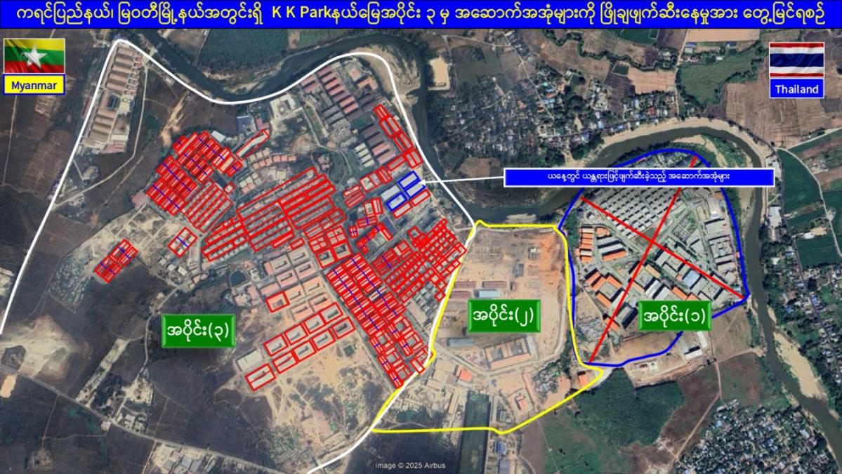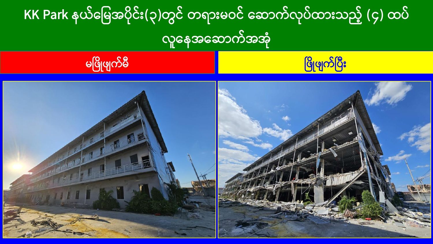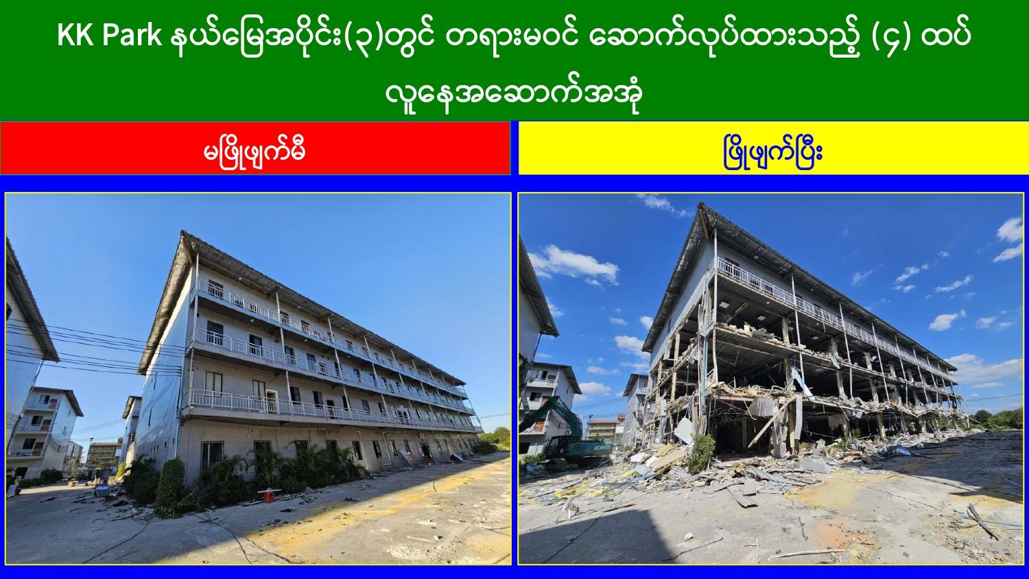 KK Park နယ်မြေအတွင်းရှိ အွန်လိုင်းလိမ်လည်လောင်းကစားမှုကျူးလွန်ရာတွင် အသုံးပြုသည့် အဆောက်အအုံ ၄၈၅ လုံး စနစ်တကျ ဖြိုချဖျက်ဆီးပြီးဖြစ်၊ အွန်လိုင်းလိမ်လည်လောင်းကစားမှုကျူးလွန်ရာတွင် အသုံးပြုသည့် ပစ္စည်းများအား မီးရှို့ဖျက်ဆီး