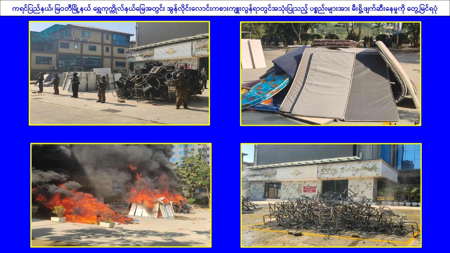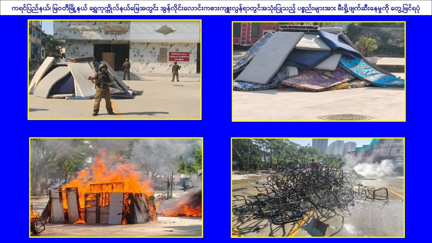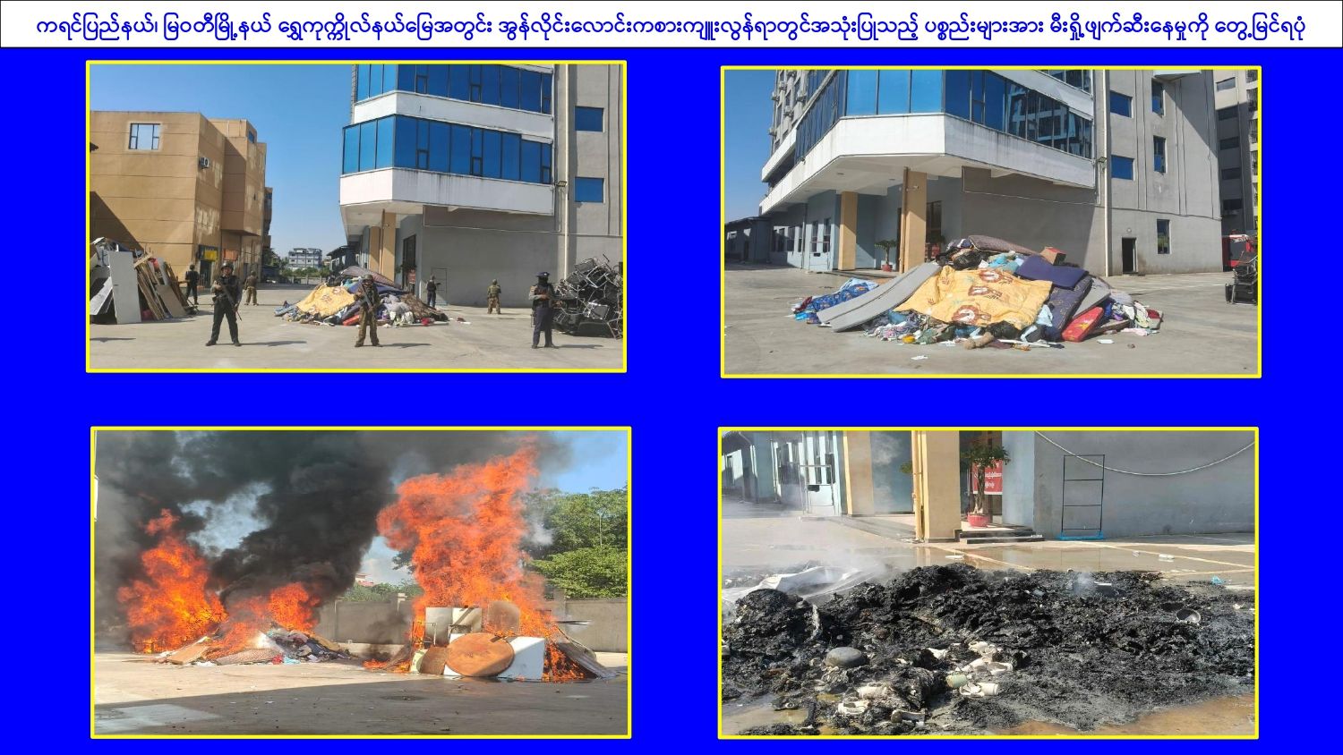 ၎င်းအပြင် မြဝတီမြို့နယ်အတွင်းရှိ KK Park နယ်မြေနှင့် ရွှေကုက္ကိုလ်နယ်မြေတို့၌ အွန်လိုင်းလိမ်လည်လောင်းကစားမှုကျူးလွန်ရာတွင် အသုံးပြုသည့်ပစ္စည်းများအား ထပ်မံ၍ အသုံးပြုနိုင်ခြင်းမရှိစေရန်အတွက် ယနေ့တွင်လည်း စနစ်တကျမီးရှို့ဖျက်ဆီးခဲ့ကြောင်း သိရှိရသည်။