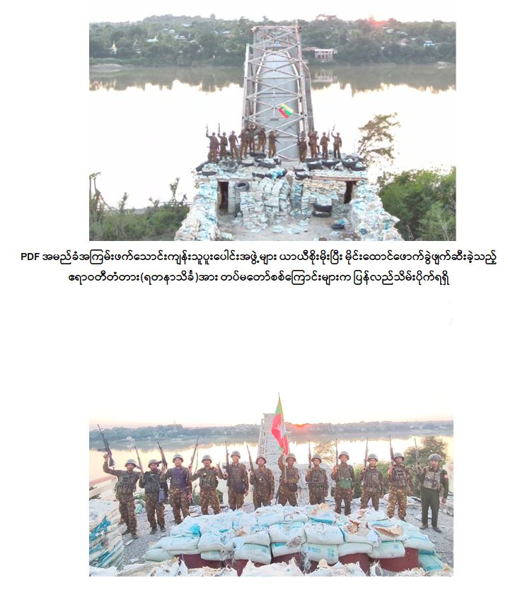 PDF အမည်ခံအကြမ်းဖက်သောင်းကျန်းသူပူးပေါင်းအဖွဲ့များအနေဖြင့် အဆိုပါဒေသအား ယာယီစိုးမိုးထားစဉ် မြို့/ရွာများအတွင်း ဘာသာရေးဆိုင်ရာ အဆောက်အအုံများ၊ စာသင်ကျောင်းများ၊ ဌာနဆိုင်ရာအဆောက်အအုံများ၊ ဆေးရုံများနှင့် လူနေအိမ်များအတွင်း ဝင်ရောက်နေရာယူ၍ ဘန်ကာများပြုလုပ်ခြင်း၊ ပြည်သူများ၏အိုးအိမ်များကို ခံစစ်တံတိုင်းအဖြစ်အကာကွယ်ရယူ၍ ပစ်ခတ်တိုက်ခိုက်ခြင်း၊ ပြည်သူများအဓိကသွားလာအသုံးပြုလျက်ရှိသည့် လမ်း/တံတားများအားမိုင်းထောင်ဖောက်ခွဲခြင်းများ ဆောင်ရွက်လျက်ရှိရာ အောက်တိုဘာ ၂၉ ရက်တွင်လည်း မန္တလေးတိုင်းဒေသကြီး၊ စဉ့်ကူးမြို့နှင့် စစ်ကိုင်းတိုင်းဒေသကြီး၊ ကျောက်မြောင်းမြို့ကို ဆက်သွယ်ထား၍ ပြည်သူလူထု၏ လမ်းပန်းဆက်သွယ်ရေးနှင့် ကုန်စည်စီးဆင်းမှုတို့အတွက်အဓိကအရေးပါသည့် ဧရာဝတီတံတား(ရတနာသိင်္ခ)ကိုလည်း မိုင်းထောင်ဖောက်ခွဲဖျက်ဆီးခဲ့သဖြင့် တံတား၏ရေလယ်တိုင်များဖြစ်သည့် တိုင်အမှတ် RP4 နှင့် RP5 တို့အကြားတွင်လည်းကောင်း၊ RP6-A2 ချဉ်းကပ်လမ်းနေရာတို့တွင်လည်းကောင်း ကျိုးကျပျက်စီးခဲ့သဖြင့် မော်တော်ယာဉ်များနှင့် ခရီးသွားပြည်သူများဖြတ်သန်း သွားလာနိုင်ခြင်းမရှိတော့ဘဲ ကုန်စည်စီးဆင်းမှုများ ရပ်တန့်ခဲ့ရသည်။