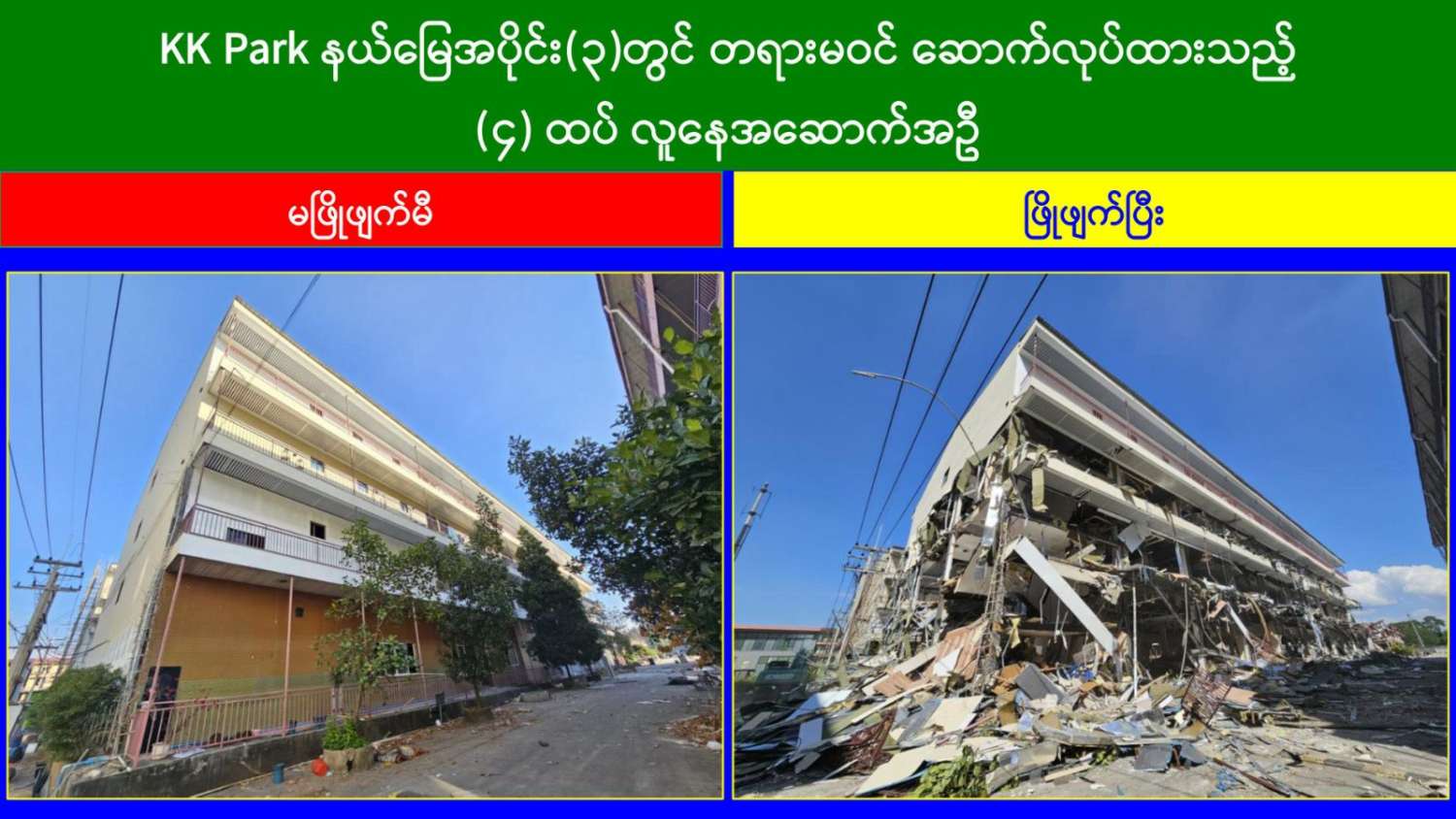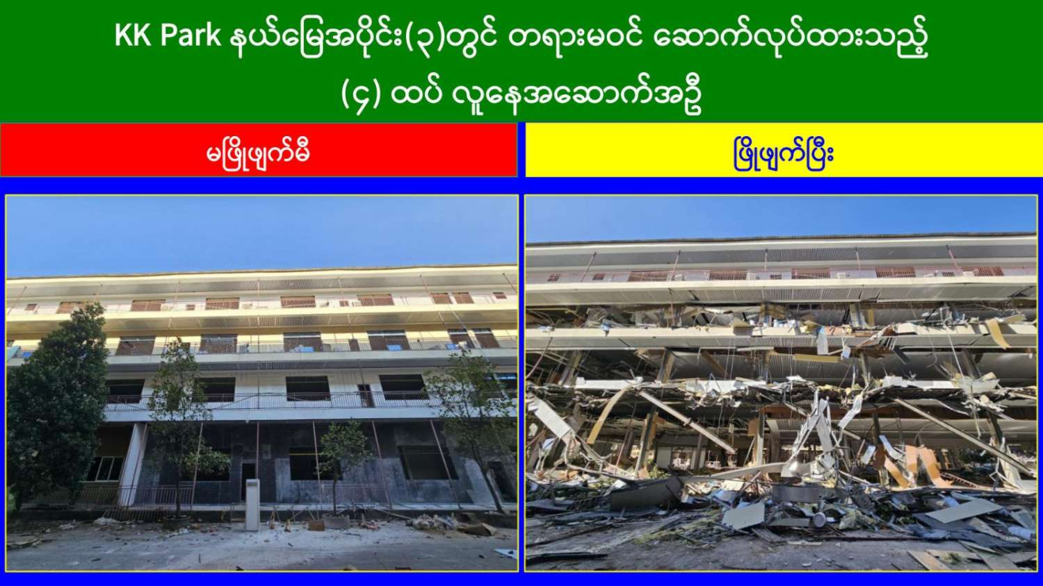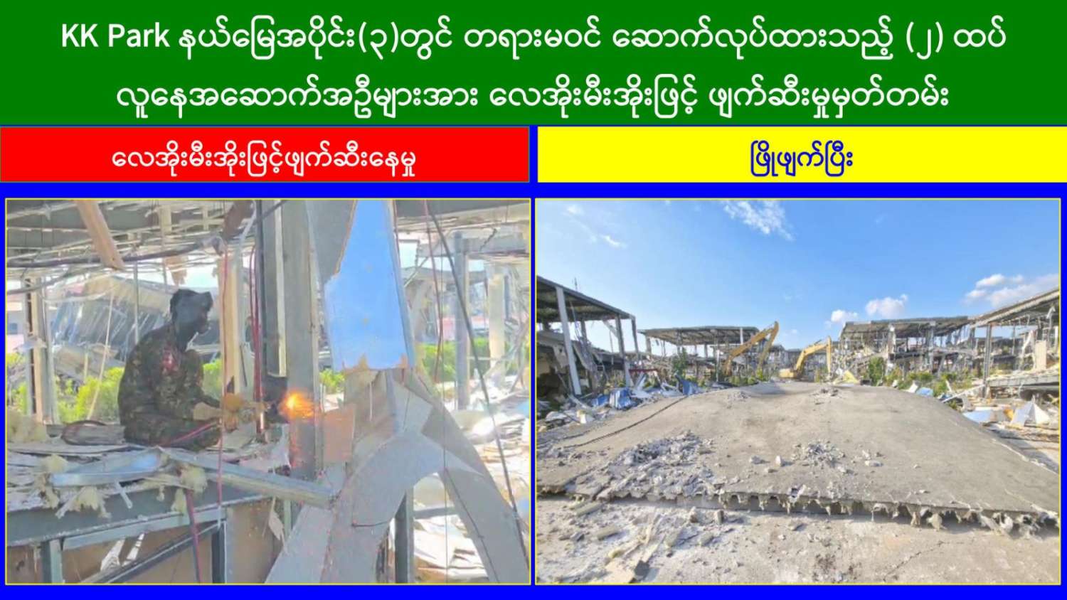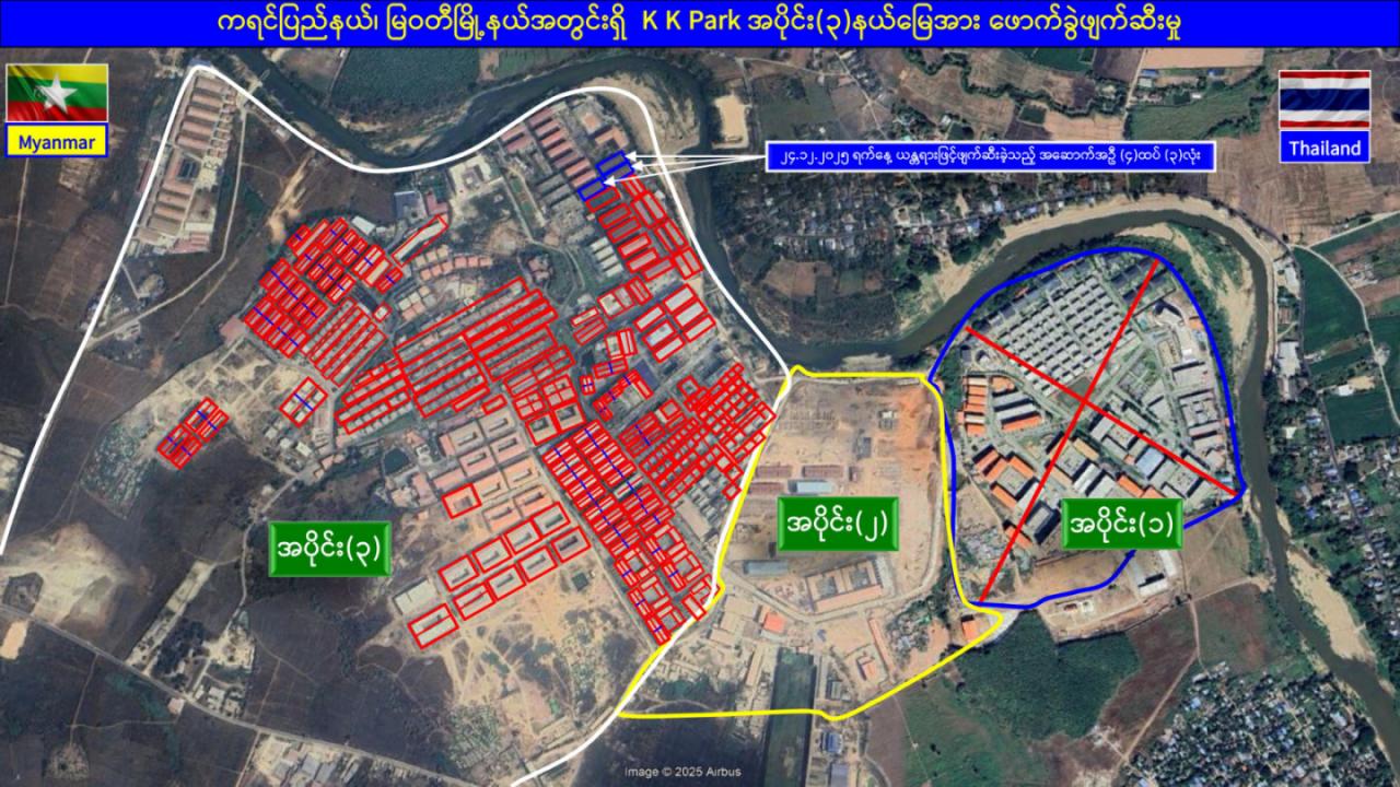 ထိုသို့ အွန်လိုင်းလိမ်လည်လောင်းကစားမှုတိုက်ဖျက်ရေး လုပ်ငန်းများဆောင်ရွက်လျက်ရှိရာ ယနေ့တွင် မြဝတီ-မဲထော်သလေး (KK Park) နယ်မြေအတွင်းရှိ အွန်လိုင်းလိမ်လည်လောင်းကစားမှုများကျူးလွန်ရာတွင် အသုံးပြုခဲ့သည့် အပိုင်း (၃) နယ်မြေအတွင်းရှိ တရားမဝင် ၄ ထပ်အဆောက်အအုံ ၃ လုံးကို ထပ်မံဖြိုချဖျက်ဆီးခဲ့သဖြင့် KK Park နယ်မြေအတွင်းရှိ တရားမဝင်အဆောက်အအုံစုစုပေါင်း ၆၃၅ လုံးအနက် ၄၉၄ လုံးကို စနစ်တကျ ဖြိုချဖျက်ဆီးပြီးဖြစ်ကြောင်း သိရှိရသည်။ အဆိုပါ KK Park နယ်မြေအတွင်းရှိ အဆောက်အအုံများအနက် ယာဉ်ယန္တရားများအသုံးပြု၍ ဖြိုချဖျက်ဆီးခြင်းများ ဆောင်ရွက်ပြီးစီးခဲ့သည့် တရားမဝင်အဆောက်အအုံများကို အလုံးစုံပျက်စီးစေရန်အတွက် လေအိုးမီးအိုးဖြင့် ထပ်မံဖျက်ဆီးခြင်းများကိုလည်း ဒီဇင်ဘာ ၁၄ ရက်မှ စတင်ဆောင်ရွက်ခဲ့ရာ ယနေ့တွင် ၂ ထပ်အဆောက်အအုံ ၅ လုံးကို ထပ်မံဖျက်ဆီးနိုင်ခဲ့သဖြင့် စုစုပေါင်း ၂ ထပ် အဆောက်အအုံ ၄၆ လုံးကို ရာခိုင်နှုန်းပြည့်ဖျက်ဆီးပြီးဖြစ်ကြောင်း သိရှိရသည်။
