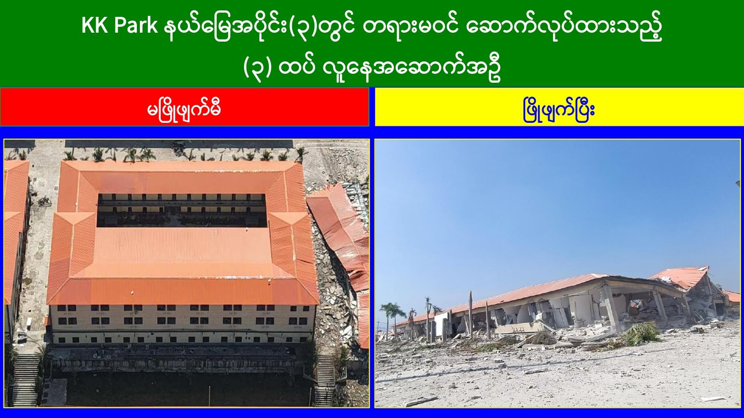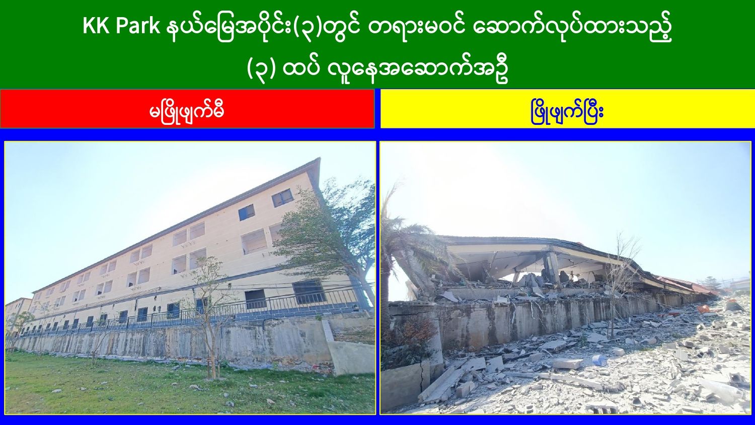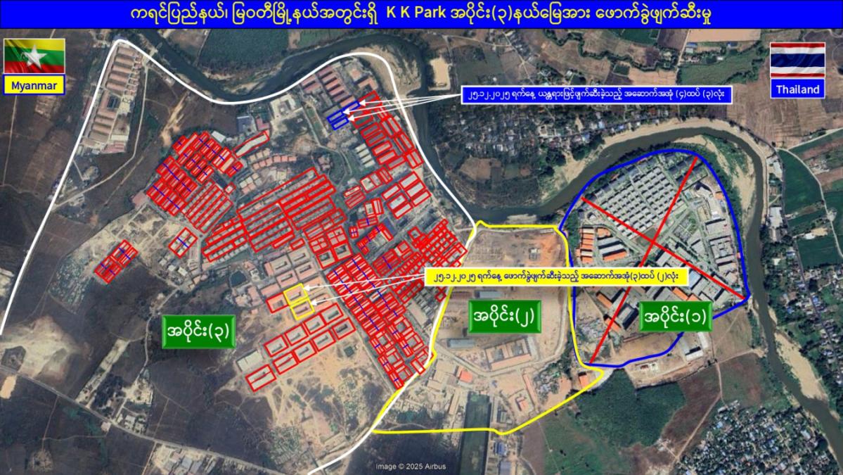 ထိုသို့ အွန်လိုင်းလိမ်လည်လောင်းကစားမှုတိုက်ဖျက်ရေး လုပ်ငန်းများဆောင်ရွက်လျက်ရှိရာ ယနေ့တွင် မြဝတီ-မဲထော်သလေး(KK Park) နယ်မြေအတွင်းရှိ အွန်လိုင်းလိမ်လည်လောင်းကစားမှုများကျူးလွန်ရာတွင် အသုံးပြုခဲ့သည့် အပိုင်း(၃)နယ်မြေအတွင်းရှိ တရားမဝင် ၄ ထပ်အဆောက်အအုံ ၃ လုံး၊ ၃ ထပ်အဆောက်အအုံ ၂ လုံးတို့ကို ထပ်မံဖြိုချဖျက်ဆီးခဲ့သဖြင့် KK Park နယ်မြေအတွင်းရှိ တရားမဝင်အဆောက်အအုံ စုစုပေါင်း ၆၃၅ လုံး အနက် ၄၉၉ လုံးကို စနစ်တကျဖြိုချဖျက်ဆီးပြီးဖြစ်ကြောင်း သိရှိရသည်။ အဆိုပါ KK Park နယ်မြေအတွင်းရှိ အဆောက်အအုံများအနက် ယာဉ်ယန္တရားများအသုံးပြု၍ ဖြိုချဖျက်ဆီးခြင်းများ ဆောင်ရွက်ပြီးစီးခဲ့သည့် တရားမဝင်အဆောက်အအုံများကို အလုံးစုံပျက်စီးစေရန်အတွက် လေအိုးမီးအိုးဖြင့် ထပ်မံဖျက်ဆီးခြင်းများကိုလည်း ဒီဇင်ဘာ ၁၄ ရက်မှ စတင်ဆောင်ရွက်ခဲ့ရာ ယနေ့တွင် ၄ ထပ် အဆောက်အအုံ ၃ လုံးကို ထပ်မံဖျက်ဆီးနိုင်ခဲ့သဖြင့် စုစုပေါင်းအဆောက်အအုံ ၄၉ လုံးကို ရာခိုင်နှုန်းပြည့်ဖျက်ဆီးပြီးဖြစ်ကြောင်း သိရှိရသည်။