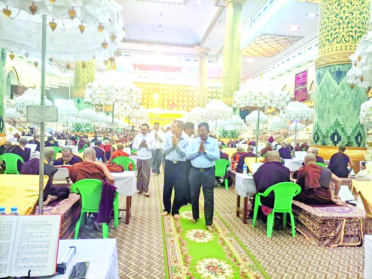 ထို့နောက် ပြည်ထောင်စုဝန်ကြီးများသည် တိပိဋကဓရ တိပိဋကကောဝိဒ ဩဝါဒါစရိယအဖွဲ့ဥက္ကဋ္ဌ ဧရာဝတီတိုင်းဒေသကြီး ဟင်္သာတမြို့ မိုးကောင်းပရိယတ္တိစာသင်တိုက် ပဓာနနာယက အဘိဓဇမဟာရဋ္ဌဂုရု၊ အဘိဓဇအဂ္ဂမဟာသဒ္ဓမ္မ ဇောတိက ဘဒ္ဒန္တသုဓမ္မာစာရာဘိဝံသထံမှ ဩဝါဒခံယူကြပြီး တိပိဋကဓရ တိပိဋကကောဝိဒဩဝါဒါ စရိယဆရာတော်ကြီးများထံ သင်္ကန်းစသော နဝကမ္မလှူဖွယ်ဝတ္ထုပစ္စည်းများ ဆက်ကပ်လှူဒါန်းကြကာ ဩဝါဒါစရိယအဖွဲ့ အကျိုးတော်ဆောင်ဆရာတော် ရန်ကုန်တိုင်းဒေသကြီး ဗဟန်းမြို့နယ်ပါဠိတက္ကသိုလ် ညောင်တုန်းကျောင်းတိုက် ပဓာနနာယက အဂ္ဂမဟာ ပဏ္ဍိတ၊ အဂ္ဂမဟာသဒ္ဓမ္မ ဇောတိကဓဇ ဘဒ္ဒန္တနာရဒါ ဘိဝံသထံမှ အနုမောဒနာတရားနာယူ၍ လှူဒါန်းမှုအစုစုအတွက် ရေစက်သွန်းလောင်း အမျှပေးဝေကြသည်။