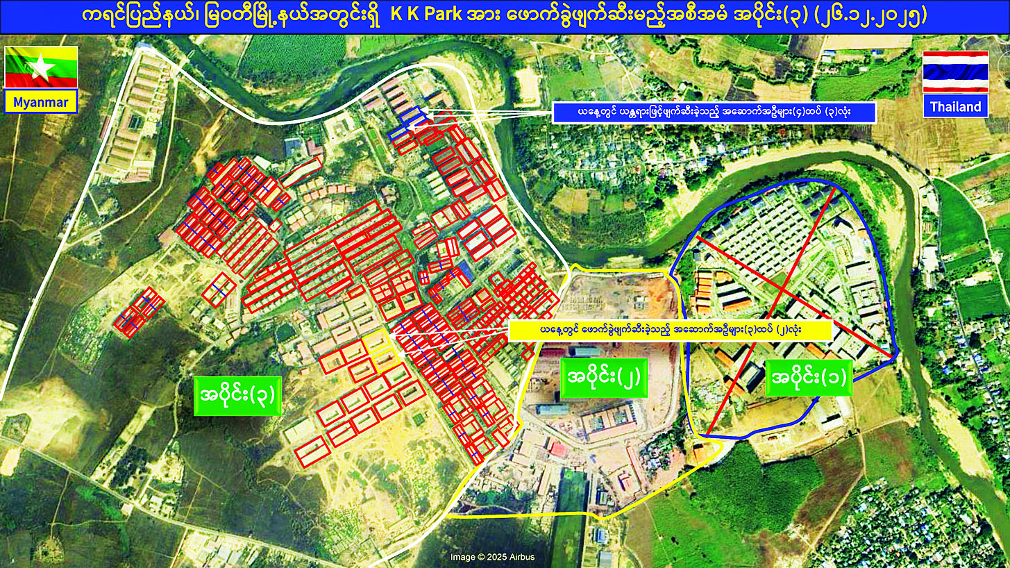 KK Park နယ်မြေအတွင်း အွန်လိုင်းလိမ်လည်လောင်းကစားမှု ကျူးလွန်ရာတွင် အသုံးပြုသည့် တရားမဝင်အဆောက်အအုံ ၅၀၄ လုံးကို စနစ်တကျဖြိုချဖျက်ဆီးပြီးစီး၊ အွန်လိုင်းလိမ်လည်လောင်းကစားမှုကျူးလွန်ရာတွင် အသုံးပြုခဲ့သည့်ပစ္စည်းများအား စနစ်တကျဆက်လက်မီးရှို့ဖျက်ဆီး