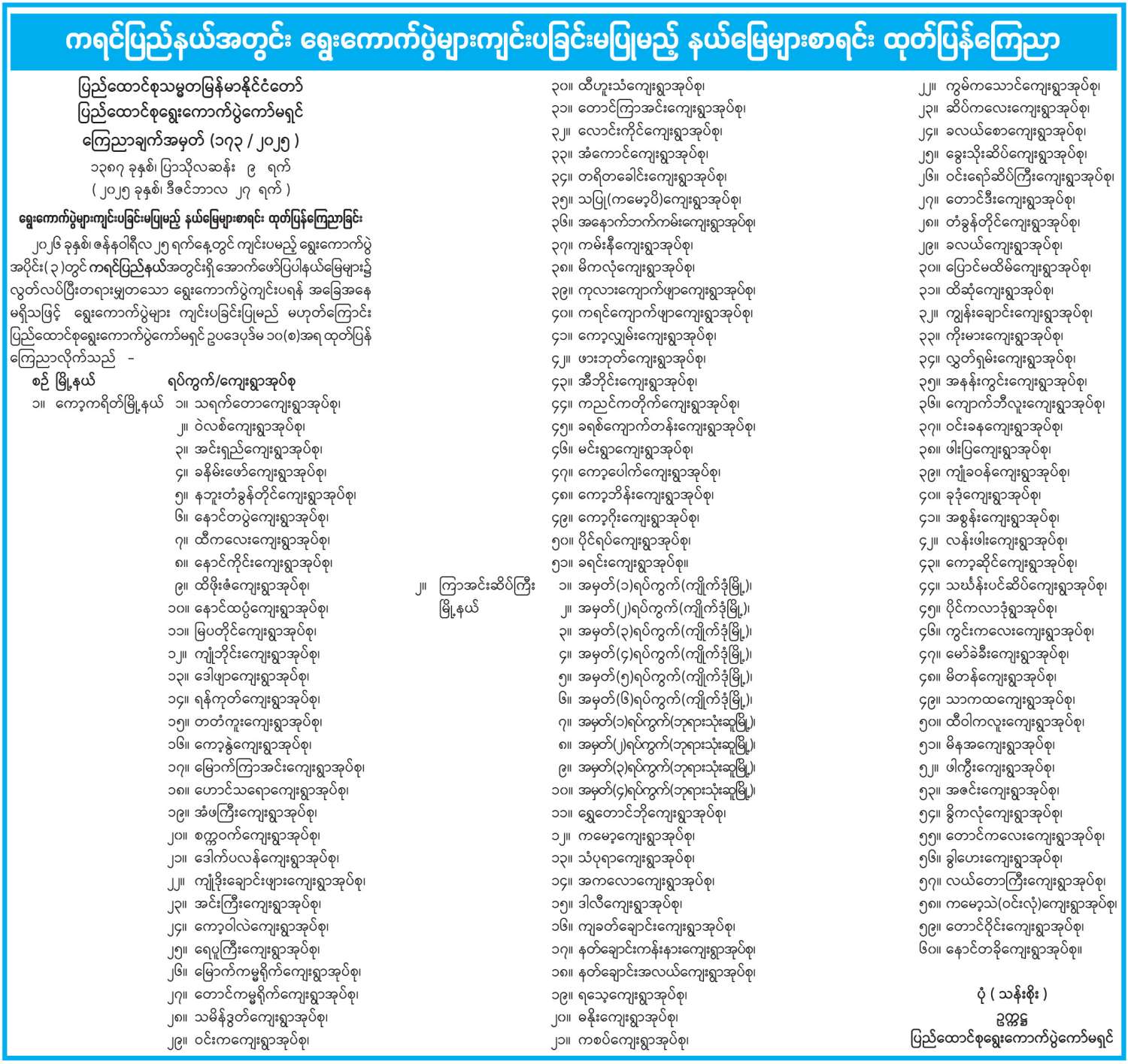 ကရင်ပြည်နယ်အတွင်း ရွေးကောက်ပွဲများကျင်းပခြင်းမပြုမည့် နယ်မြေများစာရင်း ထုတ်ပြန်ကြေညာ