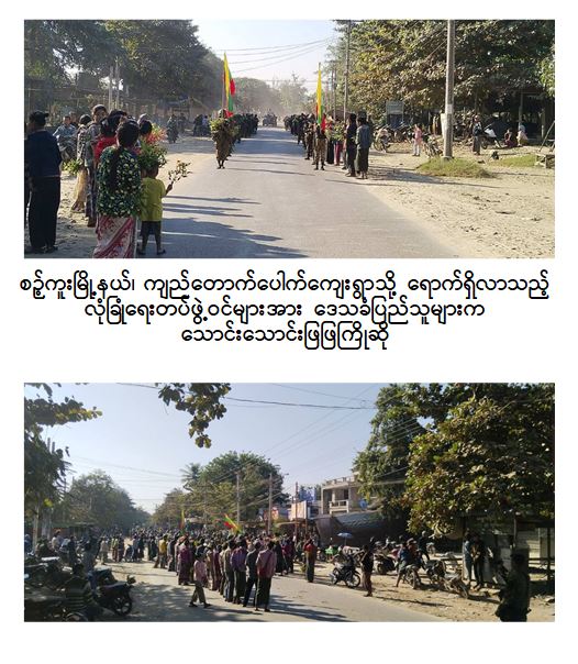 တပ်မတော်စစ်ကြောင်းများအနေဖြင့် အဆိုပါစဉ့်ကူးမြို့နယ်အတွင်း အကြမ်းဖက်သောင်းကျန်းသူများ ခိုအောင်းနေထိုင်မှုမရှိစေရေးအတွက် လိုအပ်သည့် နယ်မြေလုံခြုံရေးလုပ်ငန်းများကို ဆောင်ရွက်လျက်ရှိပြီး ယနေ့တွင် စဉ့်ကူးမြို့နယ်၊ ကျည်တောက်ပေါက်ကျေးရွာသို့ ရောက်ရှိကြရာ ဒေသခံတိုင်းရင်းသားပြည်သူများက အောင်သပြေပန်းများ၊ ပန်းကုံးများဖြင့် သောင်းသောင်းဖြဖြ ဝမ်းပန်းတသာကြိုဆိုကြသည်။