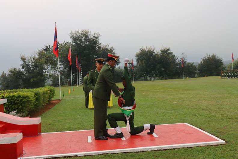 ထို့နောက် သင်တန်းကျောင်းများအလိုက် သက်ဆိုင်ရာတာဝန်ရှိသူများက သင်တန်းဆင်းအမှာစကားများ အသီးသီးပြောကြားကြပြီး သင်တန်းဆင်းထူးချွန်ဆု များဖြစ်သည့် စံပြတပ်သားဆု၊ စစ်ရေးပြထူးချွန်ဆု၊ လက်ဖြောင့်တပ်သားဆု၊ စစ်သည်တော်ကျင့်ဝတ်ဆု၊ မိုင်းကျွမ်းကျင်ဆု၊ တပ်စိတ်တိုက်နည်း ပထမဆု၊ ချေမှုန်းရေးပထမဆု၊ အိပ်ဆောင်အကောင်းဆုံးဆု ရရှိသူများအား ဆုများအသီးသီး ပေးအပ်ချီးမြှင့်ကြသည်။