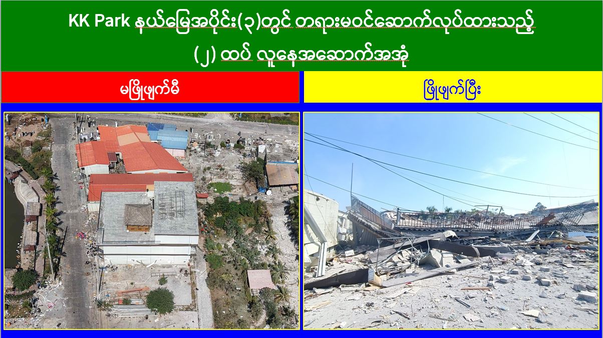 ယနေ့တွင် မြဝတီ-မဲ့ထော်သလေး(KK Park) အပိုင်း(၃)နယ်မြေအတွင်းရှိ အွန်လိုင်းလိမ်လည်လောင်းကစားမှုများကျူးလွန်ရာတွင် အသုံးပြုခဲ့သည့် တရားမဝင် ၄ ထပ် အဆောက်အအုံ ၁ လုံး၊ ၂ ထပ်အဆောက်အအုံ ၂ လုံးနှင့် တစ်ထပ်အဆောက်အအုံ ၃ လုံး စုစုပေါင်း တရားမဝင် အဆောက်အအုံ ၆ လုံးတို့ကို ထပ်မံဖြိုချဖျက်ဆီးခဲ့သဖြင့် KK Park နယ်မြေအတွင်းရှိ တရားမဝင်အဆောက်အအုံ စုစုပေါင်း ၆၃၅ လုံးအနက် ၅၂၅ လုံးကို စနစ်တကျဖြိုချဖျက်ဆီးပြီးဖြစ်ကြောင်း သိရှိရသည်။