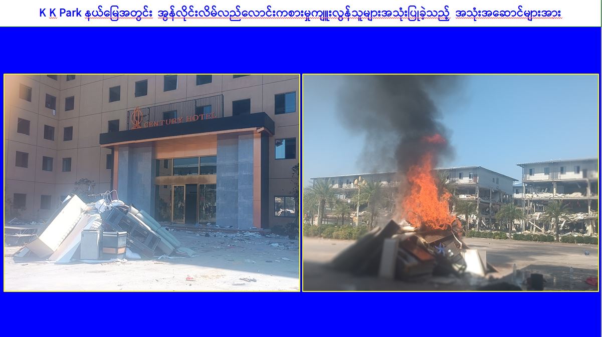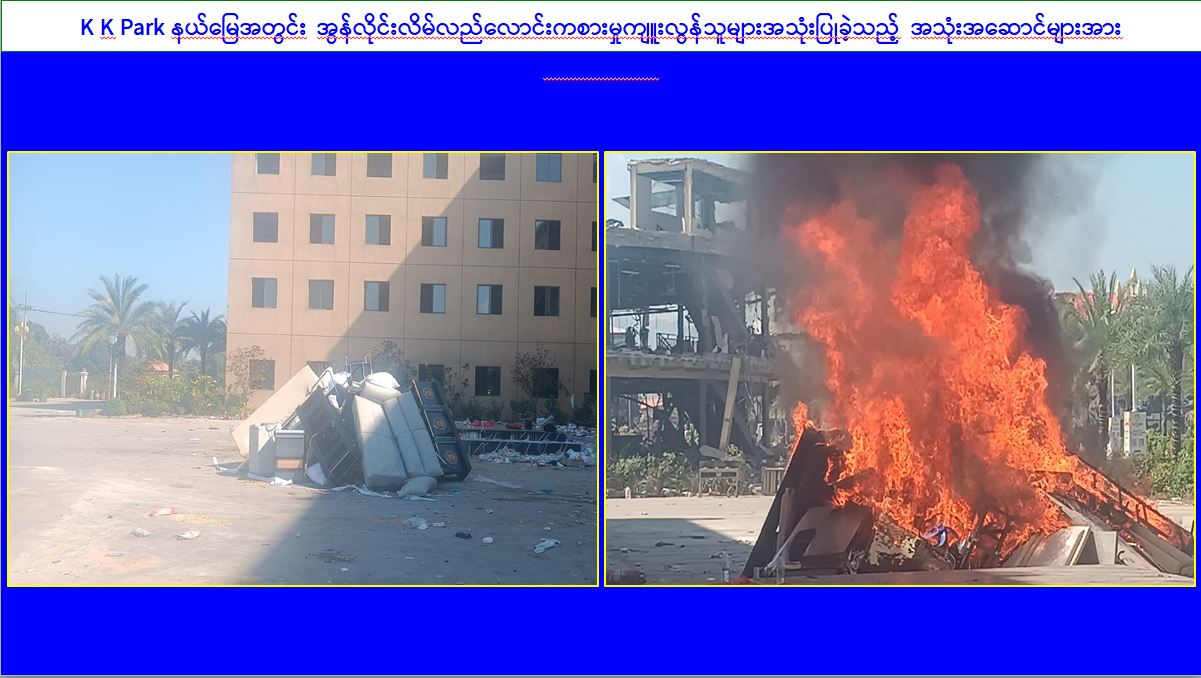 ၎င်းအပြင် KK park နယ်မြေအတွင်းရှိ အွန်လိုင်းလိမ်လည်လောင်းကစားမှုကျူးလွန်ရာတွင် အသုံးပြုခဲ့သည့်ပစ္စည်းများအား ထပ်မံအသုံးပြုမှုမရှိစေရေးအတွက် ယနေ့တွင်လည်း စနစ်တကျမီးရှို့ဖျက်ဆီးခဲ့ကြောင်းနှင့် နိုင်ငံတော်အစိုးရအနေဖြင့် အွန်လိုင်းလိမ်လည်လောင်းကစားမှုကျူးလွန်မှုများကို အမျိုးသားရေးတာဝန်တစ်ရပ်အဖြစ်ခံယူကာ မြန်မာနိုင်ငံအတွင်း လုံးဝအခြေမပြုနိုင်ရေး ပြည်တွင်းအင်အားစုများအပြင် အိမ်နီးချင်းနိုင်ငံအစိုးရများနှင့်လည်း ပေါင်းစပ်ညှိနှိုင်း၍ ဆက်လက်ဆောင်ရွက်သွားမည်ဖြစ်ကြောင်း သတင်းရရှိသည်။