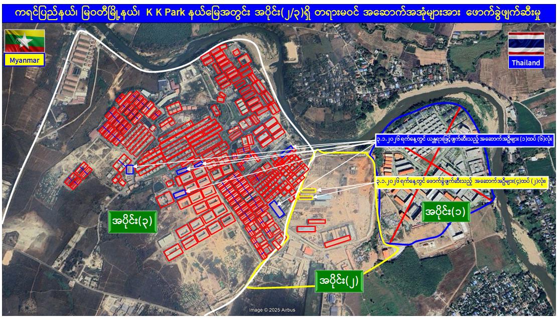 ယနေ့တွင် မြဝတီ-မဲထော်သလေး(KK Park)အပိုင်း(၃)နယ်မြေအတွင်းရှိ အွန်လိုင်းလိမ်လည်လောင်းကစားမှုများကျူးလွန်ရာတွင် အသုံးပြုခဲ့သည့် တရားမဝင် ၁ ထပ် အဆောက်အအုံ ၆ လုံးနှင့် အပိုင်း(၂)နယ်မြေအတွင်းရှိ အွန်လိုင်းလိမ်လည်လောင်းကစားမှုများ ကျူးလွန်ရာတွင် အသုံးပြုခဲ့သည့် တရားမဝင် ၄ ထပ် အဆောက်အအုံ ၂ လုံး၊ စုစုပေါင်း တရားမဝင်အဆောက်အအုံ ၈ လုံးတို့ကို ထပ်မံဖြိုချဖျက်ဆီးခဲ့သဖြင့် KK Park နယ်မြေအတွင်းရှိ တရားမဝင် အဆောက်အအုံ စုစုပေါင်း ၆၃၅ လုံး အနက် ၅၆၃ လုံးကို စနစ်တကျ ဖြိုချဖျက်ဆီးပြီး ဖြစ်ကြောင်း သိရှိရသည်။