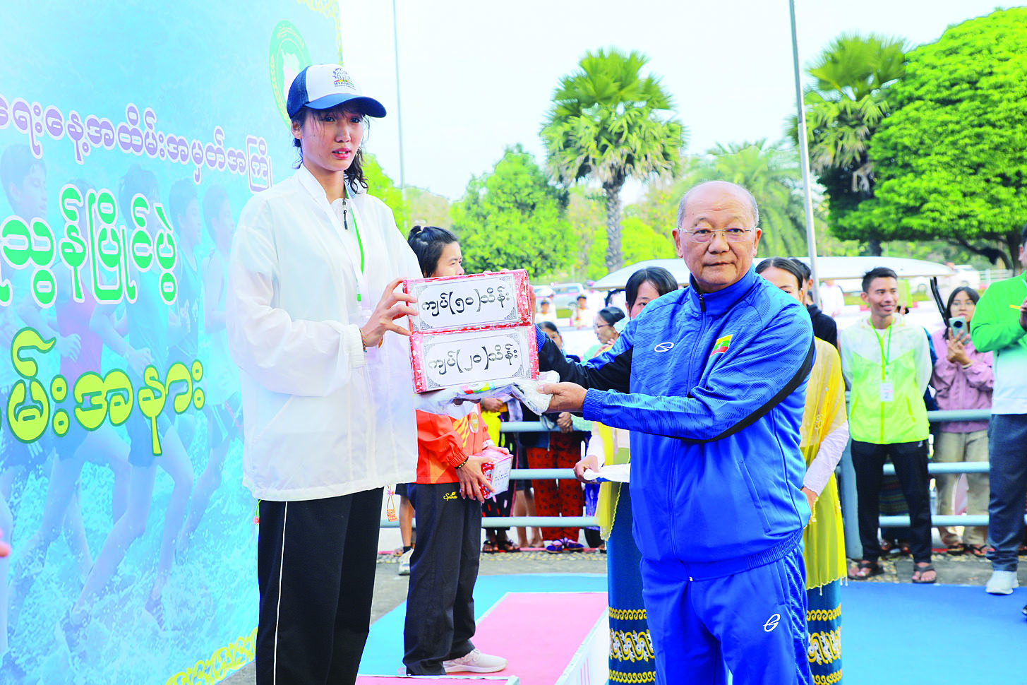 ပြိုင်ပွဲများအပြီးတွင် ဆုချီးမြှင့်ပွဲအခမ်းအနားကို ဆက်လက်ကျင်းပရာ ပြိုင်ပွဲများအသီးသီးတွင် ပထမ၊ ဒုတိယ၊ တတိယ၊ စတုတ္ထ၊ ပဉ္စမ၊ နှစ်သိမ့်ဆုများရရှိခဲ့ကြသူများနှင့် ၂၁ ကီလိုမီတာ အမျိုးသမီး (အလွတ်တန်း) မာရသွန်ပြိုင်ပွဲတွင် စံချိန် ၁:၂၄:၅၁ ( ၁ နာရီ ၂၄ မိနစ် ၅၁ စက္ကန့်) ဖြင့် လူငယ်မျိုးဆက်သစ် စံချိန်သစ်တင်နိုင်ခဲ့သည့် (Youth Camp)မှ နှင်းပွင့်အောင်တို့ကို ပြည်ထောင်စုဝန်ကြီး Jeng Phang နော်တောင်၊ နေပြည်တော်ကောင်စီဥက္ကဋ္ဌ၊ မြို့တော်ဝန် ဦးသန်းထွန်းဦး၊ ဒုတိယဝန်ကြီး ဦးထိန်လင်းနှင့် ဦးဇင်မင်းထက်၊ နေပြည်တော်ကောင်စီဝင်များ၊ အားကစားနှင့်ကာယပညာဦးစီးဌာန ညွှန်ကြားရေးမှူးချုပ်နှင့် တာဝန်ရှိသူများက တစ်ဦးချင်းဆုတံဆိပ်၊ ဂုဏ်ပြုဆုကြေးငွေများနှင့် ထပ်ဆောင်းဂုဏ်ပြုချီးမြှင့်ငွေများကို ပေးအပ်ချီးမြှင့်သည်။