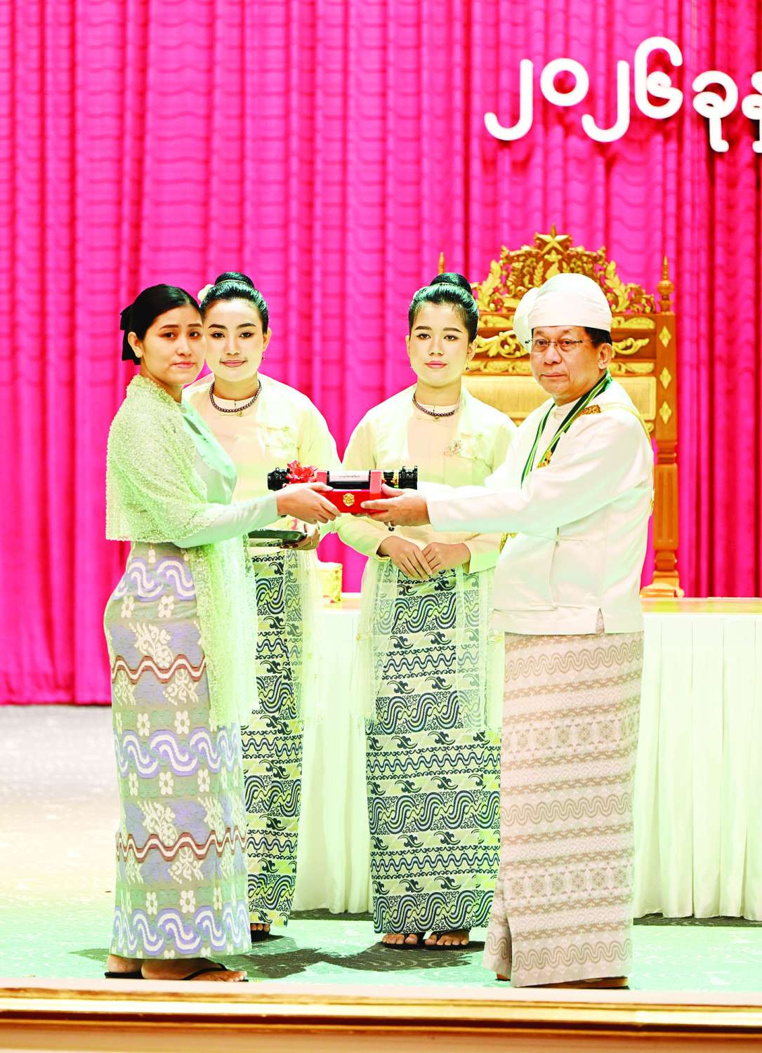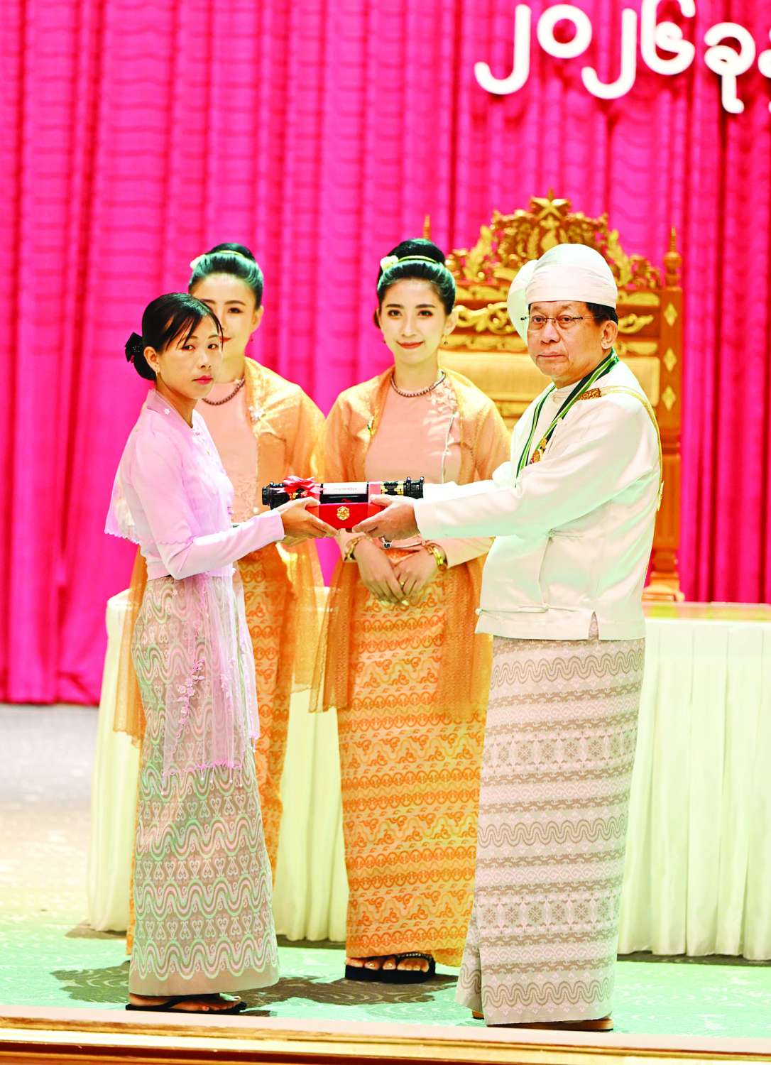 ပြည်ထောင်စုသမ္မတမြန်မာနိုင်ငံတော် ယာယီသမ္မတ နိုင်ငံတော်လုံခြုံရေးနှင့် အေးချမ်းသာယာရေးကော်မရှင်ဥက္ကဋ္ဌ     ဗိုလ်ချုပ်မှူးကြီး သတိုးမဟာသရေစည်သူ သတိုးသီရိသုဓမ္မမင်းအောင်လှိုင် (၇၈) နှစ်မြောက်လွတ်လပ်ရေးနေ့အထိမ်းအမှတ် ဂုဏ်ထူးဆောင်ဘွဲ့များ ချီးမြှင့်အပ်နှင်းခြင်းအခမ်းအနားသို့ တက်ရောက်ချီးမြှင့်