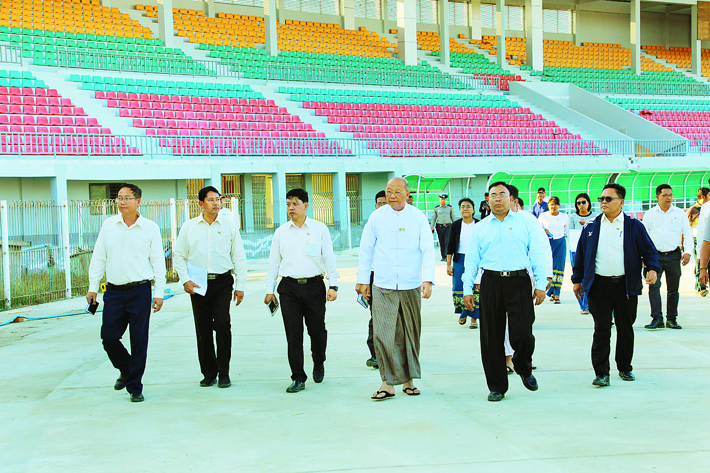 ယင်းနောက် ရှင်းလင်းဆောင်၌ သက်ဆိုင်ရာကုမ္ပဏီမှ တာဝန်ရှိသူက လုပ်ငန်းဆောင်ရွက်နေမှုများနှင့် ပတ်သက်ပြီး အသေးစိတ်ရှင်းလင်းတင်ပြရာ ပြည်ထောင်စုဝန်ကြီးက Synthetic ပြေးလမ်းအား သတ်မှတ်စံချိန်စံညွှန်းနှင့်အညီ အရည်အသွေးပြည့်မီစေရေးနှင့် သတ်မှတ်ကာလအတွင်း အချိန်မီပြီးစီးစေရေးတို့အတွက် တာဝန်ယူဆောင်ရွက်လျက်ရှိသည့် သက်ဆိုင်ရာကုမ္ပဏီမှ တာဝန်ရှိသူများအား မှာကြားကာ အားကစားကွင်းစိမ်းလန်းစိုပြည်စေရေးအတွက် ချုံနွယ်များ ရှင်းလင်းခြင်းနှင့် ပုံမှန်မြက်ဖြတ်ခြင်းလုပ်ငန်းများ ဆောင်ရွက်သွားရန် တာဝန်ရှိသူများကို မှာကြားသည်။