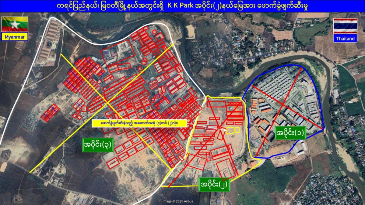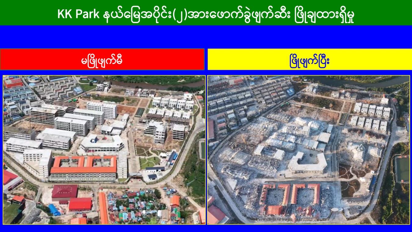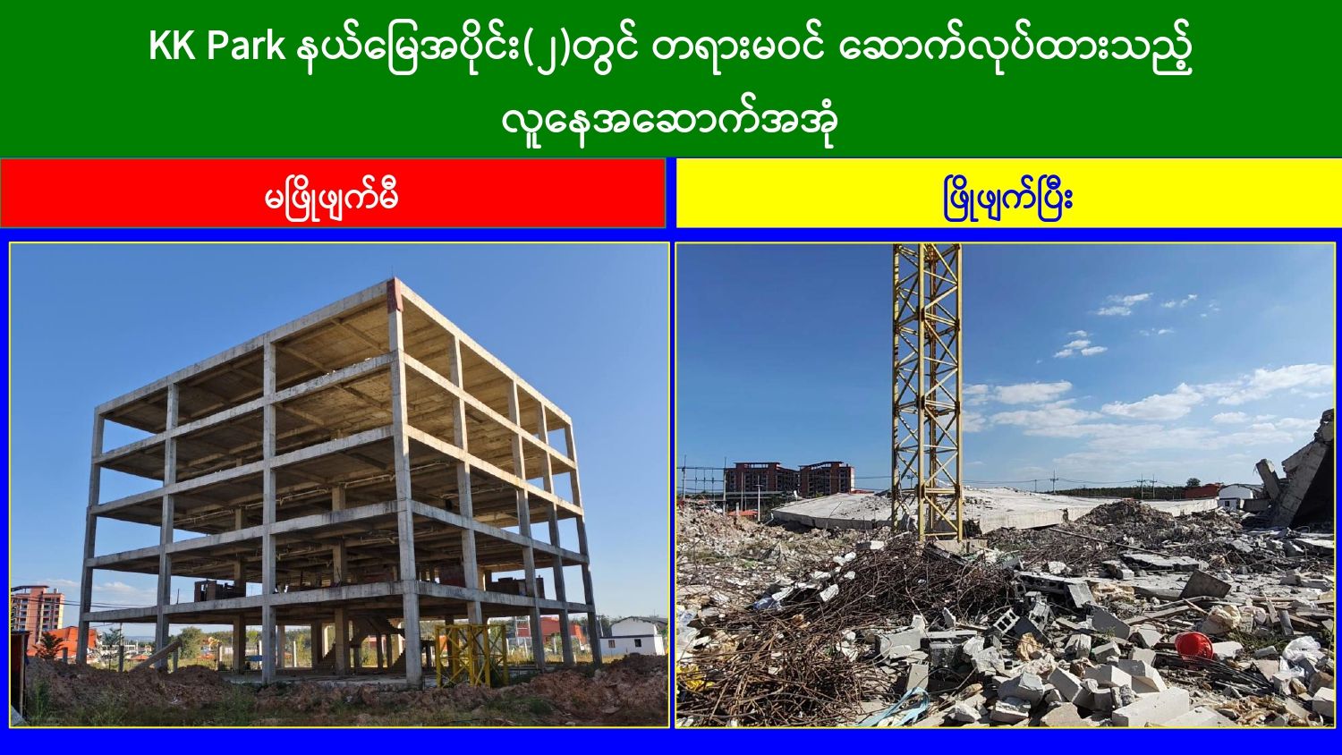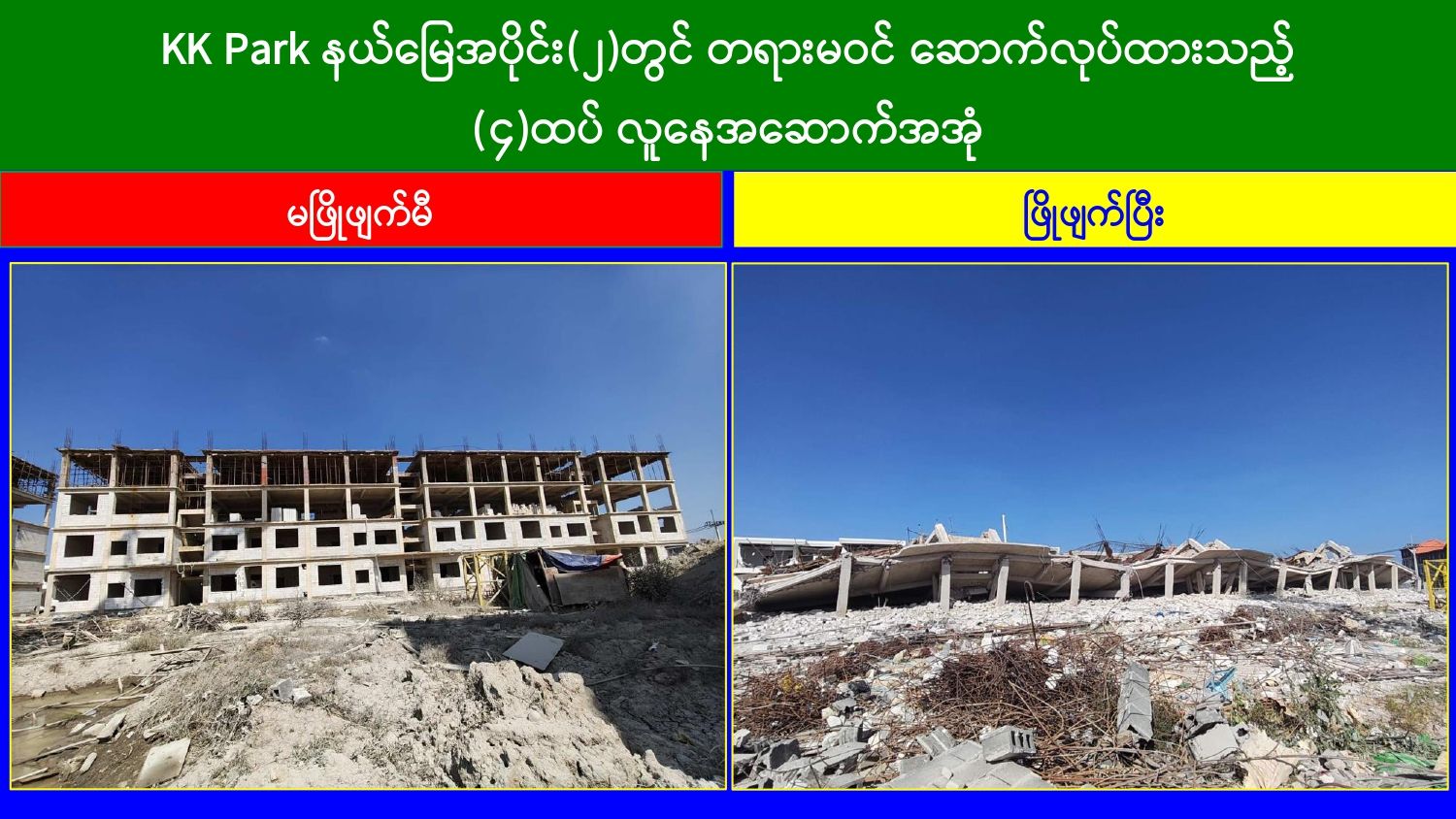 KK Park နယ်မြေအတွင်း အွန်လိုင်းလိမ်လည်လောင်းကစားမှု ကျူးလွန်ရာတွင် အသုံးပြုသည့် တရားမဝင်အဆောက်အအုံအားလုံး စနစ်တကျဖြိုချဖျက်ဆီးပြီးဖြစ်