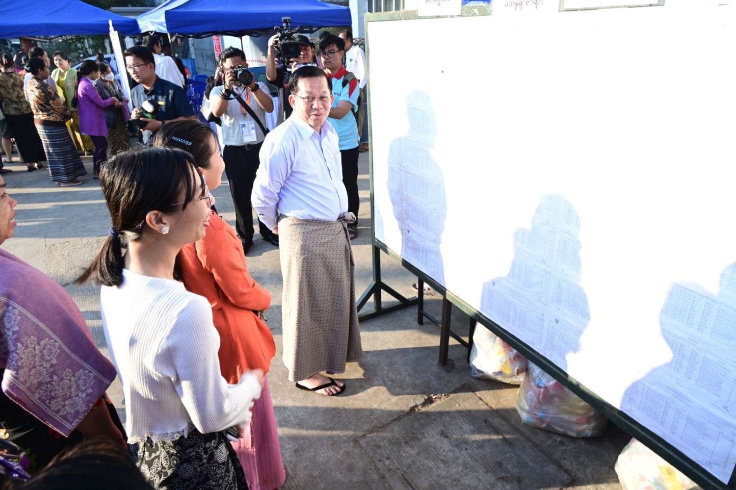 ထိုကဲ့သို့ မဲဆန္ဒရှင်ပြည်သူများ ဆန္ဒမဲများပေးနေမှုများကို နိုင်ငံတော်ယာယီသမ္မတ နိုင်ငံတော်လုံခြုံရေးနှင့် အေးချမ်းသာယာရေးကော်မရှင်ဥက္ကဋ္ဌ ဗိုလ်ချုပ်မှူးကြီး မင်းအောင်လှိုင်သည် ကော်မရှင်အတွင်းရေးမှူး ဗိုလ်ချုပ်ကြီးရဲဝင်းဦးနှင့် အဖွဲ့ဝင်များလိုက်ပါ၍ ရန်ကုန်တိုင်းဒေသကြီးအတွင်းရှိ မဲရုံများသို့ သွားရောက်ကြည့်ရှုအားပေးသည်။