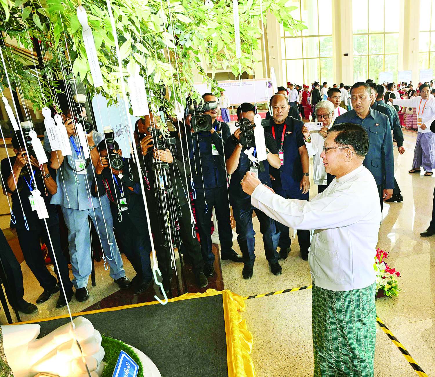 ယင်းနောက် နိုင်ငံတော်ယာယီသမ္မတ နိုင်ငံတော်လုံခြုံရေးနှင့် အေးချမ်းသာယာရေးကော်မရှင်ဥက္ကဋ္ဌက “လူငယ်ငြိမ်းချမ်းရေးဖိုရမ် ၂၀၂၆” ဖွင့်ပွဲအခမ်းအနားအား စက်ခလုတ်နှိပ်ဖွင့်လှစ်ပေးပြီး ငြိမ်းချမ်းရေးသစ်ပင်တွင် ငြိမ်းချမ်းရေးနှင့်ပတ်သက်သည့် ဆုတောင်းစာလွှာအား ချိတ်ဆွဲပေးသည်။
