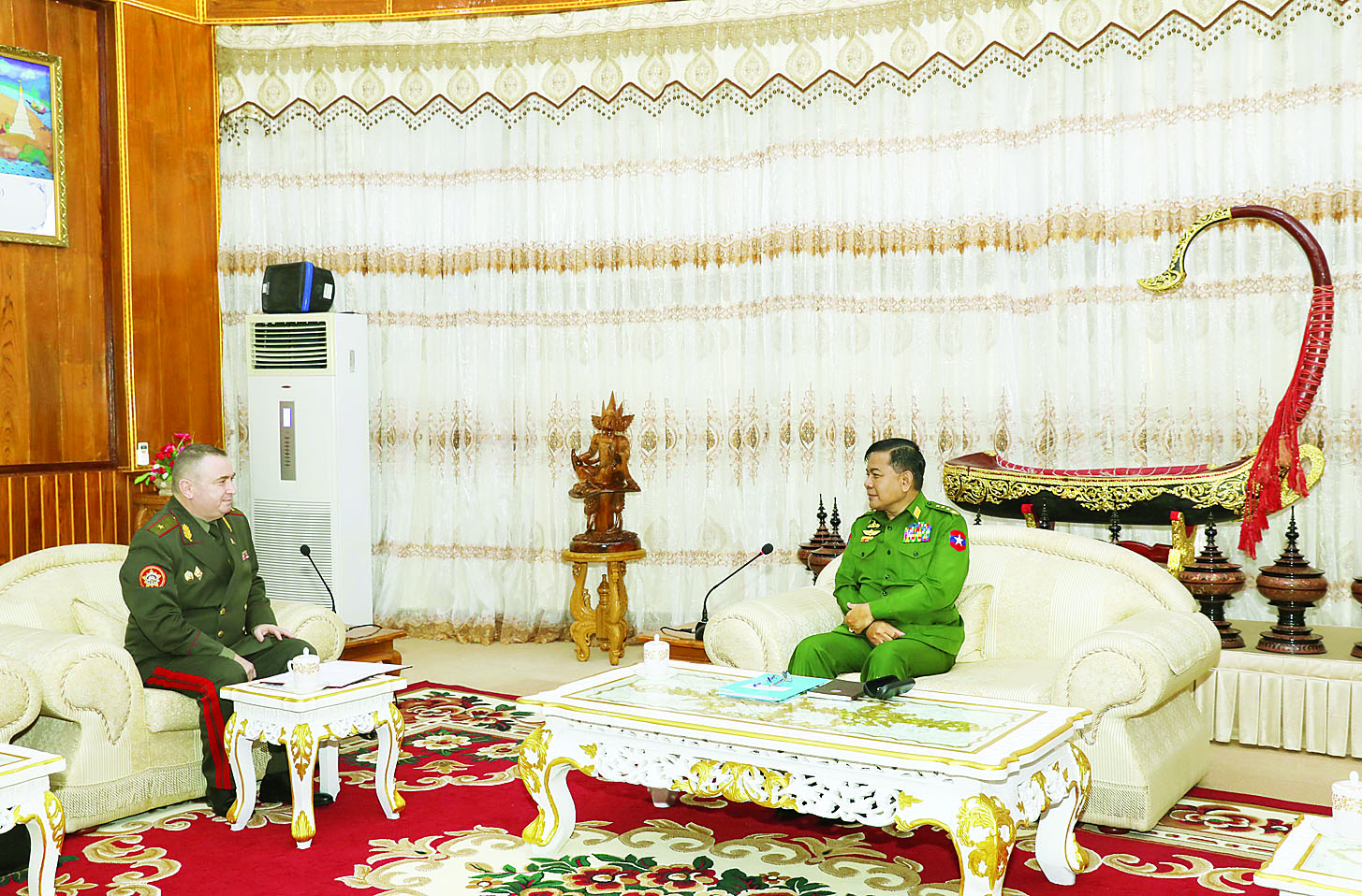ကာကွယ်ရေးဝန်ကြီးဌာန ပြည်ထောင်စုဝန်ကြီး ဗိုလ်ချုပ်ကြီး မောင်မောင်အေးအား ဘယ်လာရုစ်ကာကွယ်ရေးဝန်ကြီးဌာန နိုင်ငံတကာစစ်ဘက် ပူးပေါင်းဆောင်ရွက်ရေးဌာနကြီး၏ အကြီးအကဲနှင့် လက်ထောက်ကာကွယ်ရေးဝန်ကြီး Major General Valeriy Aleksandrovich Revenko က ယနေ့မွန်းလွဲပိုင်းတွင် ပြည်ထောင်စုဝန်ကြီးရုံး ဧည့်ခန်းမ၌ ဂါရဝပြုလာရောက်တွေ့ဆုံသည်။