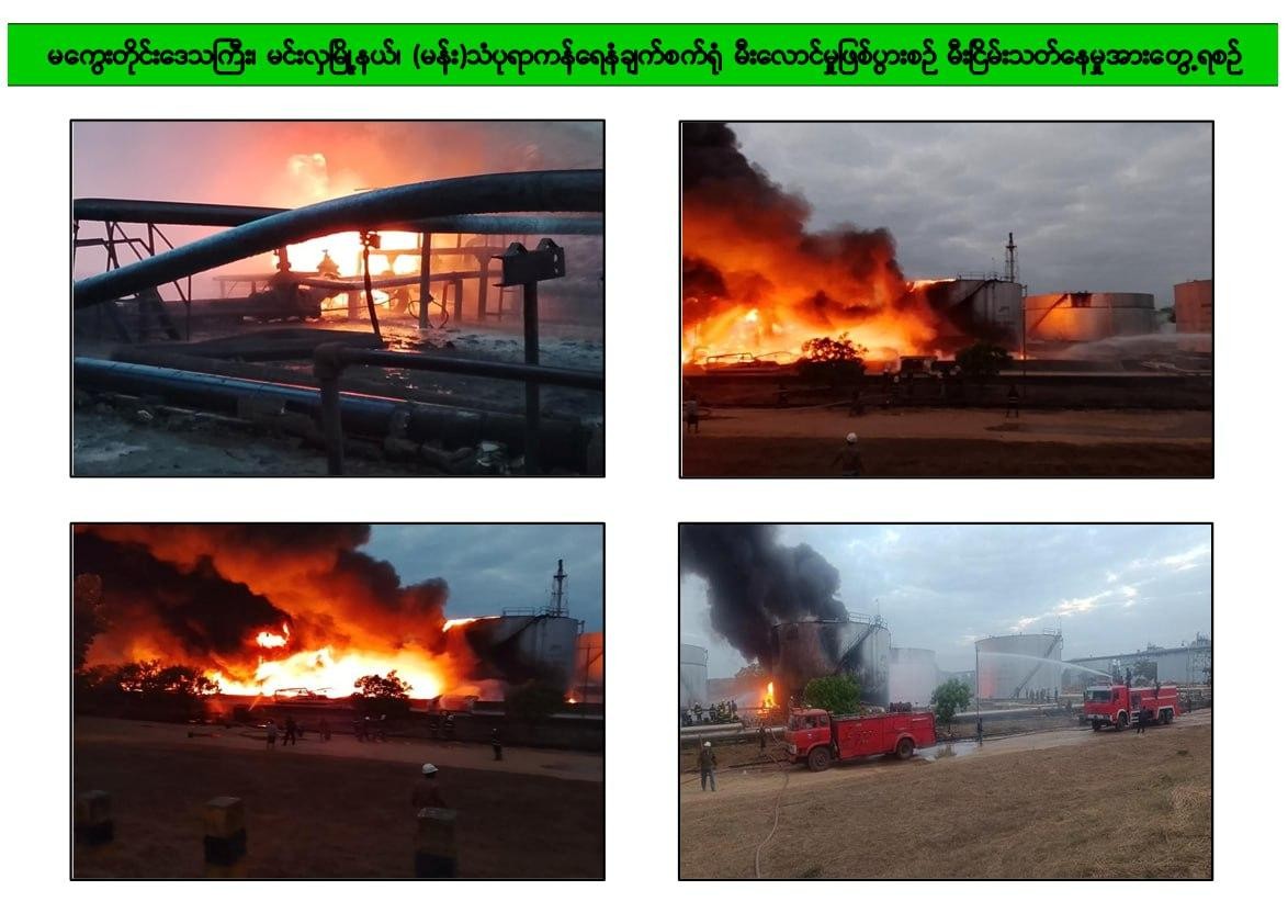 မကွေးတိုင်းဒေသကြီး၊ မင်းလှမြို့နယ်ရှိ ရေနံဓာတုဗေဒစက်ရုံစု(သံပရာကန်)၌ ယနေ့နံနက် ၆ နာရီ၊ ၅ မိနစ်ခန့်တွင် စတင်မီးလောင်ကျွမ်းမှုဖြစ်ပွားခဲ့ရာ စက်ရုံရှိမီးသတ်ဝန်ထမ်းများနှင့် စက်ရုံဝန်ထမ်းများ၊ တပ်နယ်၊ ခရိုင်၊ မြို့နယ်များရှိ မီးသတ်တပ်ဖွဲ့ဝင်များဖြင့် အတူပူးပေါင်းပြီး ဝိုင်းဝန်းငြှိမ်းသတ်နိုင်ခဲ့မှုကြောင့် နံနက် ၇ နာရီအချိန်တွင် မီးငြှိမ်းသတ်နိုင်ပြီး လက်ရှိအချိန်တွင် ကုန်ထုတ်လုပ်မှုလုပ်ငန်းများ ပုံမှန်ပြန်လည်လည်ပတ်လျက်ရှိသည်။
