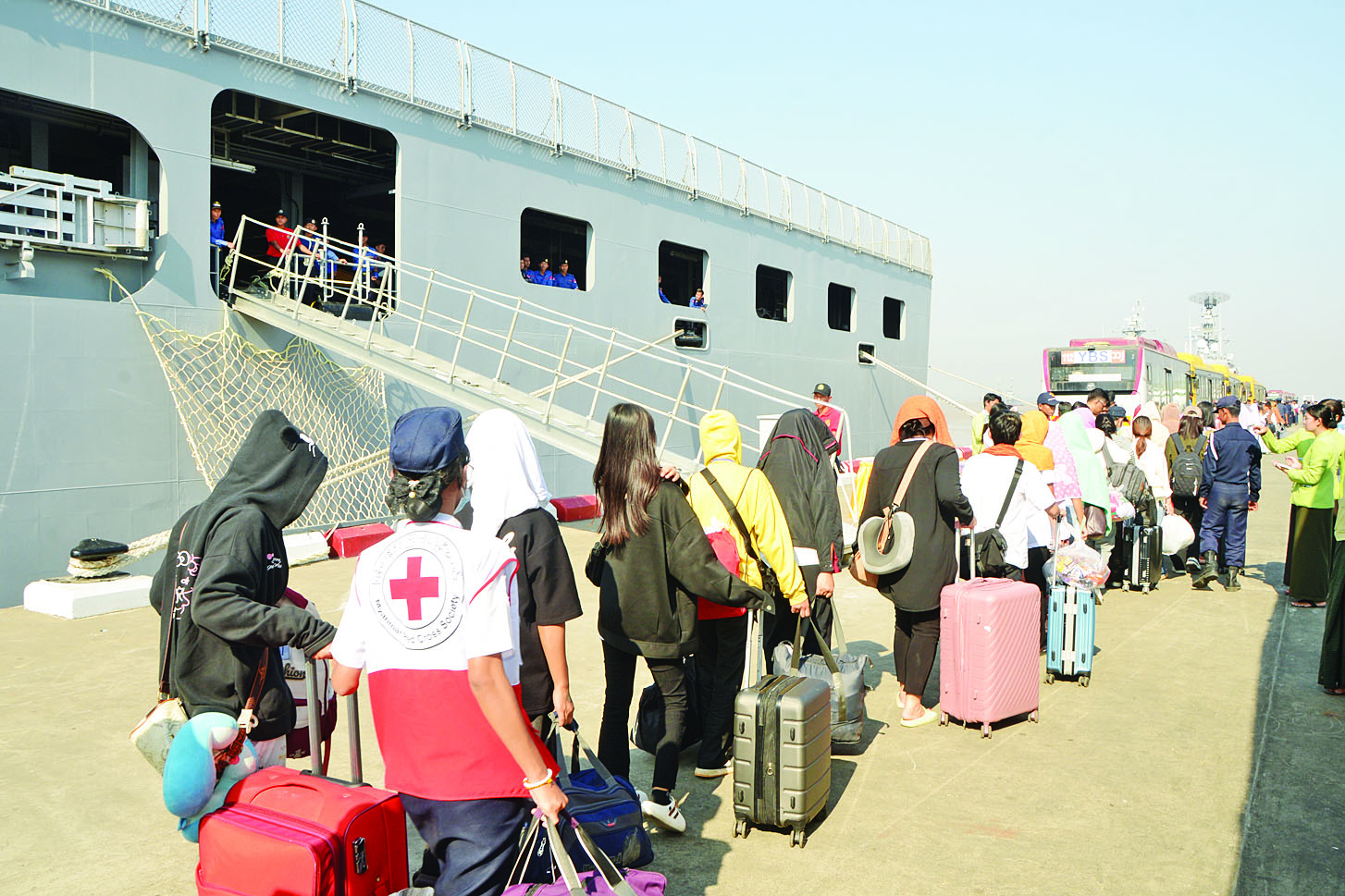 အဆိုပါ စစ်ရေယာဉ်(မုတ္တမ)သည် ဇန်နဝါရီ ၂၇ ရက် ညပိုင်းတွင် စတင်ထွက်ခွာခဲ့ပြီး ကမ္ဘောဒီးယားနိုင်ငံမှ ပြန်လည်ခေါ်ဆောင်ပေးခဲ့သည့် မြန်မာနိုင်ငံသားများအား စစ်ရေယာဉ်ပေါ်တွင် တစ်ကိုယ်ရည်သုံးပစ္စည်းများ ထောက်ပံ့ပေးအပ်ခြင်း၊ ကျန်းမာရေးစောင့်ရှောက်မှုများ ဆောင်ရွက်ပေးခြင်း၊ စားသောက်နေထိုင်မှုများ အဆင်ပြေစေရေးအတွက် ဆောင်ရွက်ပေးခြင်းတို့ကို တာဝန်ရှိသူများက ဆောင်ရွက်ပေးခဲ့သည်။ စစ်ရေယာဉ်(မုတ္တမ)သည် ယနေ့နံနက်ပိုင်းတွင် ရန်ကုန်တိုင်းဒေသကြီး၊ ရန်ကုန်မြို့ရှိ အမှတ်(၃)ဆိပ်ခံတံတားသို့ရောက်ရှိကြပြီး သန်လျင်ခရိုင် စီမံခန့်ခွဲရေးနှင့်အုပ်ချုပ်ရေးကော်မတီဥက္ကဋ္ဌနှင့် အဖွဲ့ဝင်များမှ ကြီးကြပ်၍ လူဝင်မှုကြီးကြပ်ရေးနှင့်ပြည်သူ့အင်အားဝန်ကြီးဌာန သန်လျင်ခရိုင်ရုံးမှ တာဝန်ရှိသူများက လူဦးရေတိုက်ဆိုင်စစ်ဆေးခြင်း၊ သန်လျင်ခရိုင် ကျန်မာရေးဦးစီးဌာနမှ တာဝန်ရှိသူများက ကျန်းမာရေးမကောင်းသူများအား ကျန်းမာရေးစောင့်ရှောက်မှုများ ဆောင်ရွက်ပေးခြင်း၊ ခရိုင်အတွင်းရှိဌာနဆိုင်ရာများက စားသောက်ဖွယ်ရာများအား တစ်ဦးချင်းပေးအပ်သည်။