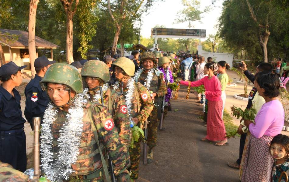 စစ်ဆင်ရေးတာဝန်များကို စွမ်းစွမ်းတမံထမ်းဆောင်ခဲ့ပြီး ရွပ်ရွပ်ချွံချွံတိုက်ပွဲဝင်ခဲ့သော အောင်ပွဲအလီလီရ ရှေ့တန်းပြန်နိုင်ငံ့သားကောင်း တပ်မတော်သားများအား ဝမ်းမြောက်စွာ သောင်းသောင်းဖြဖြ ဂုဏ်ပြုကြိုဆို