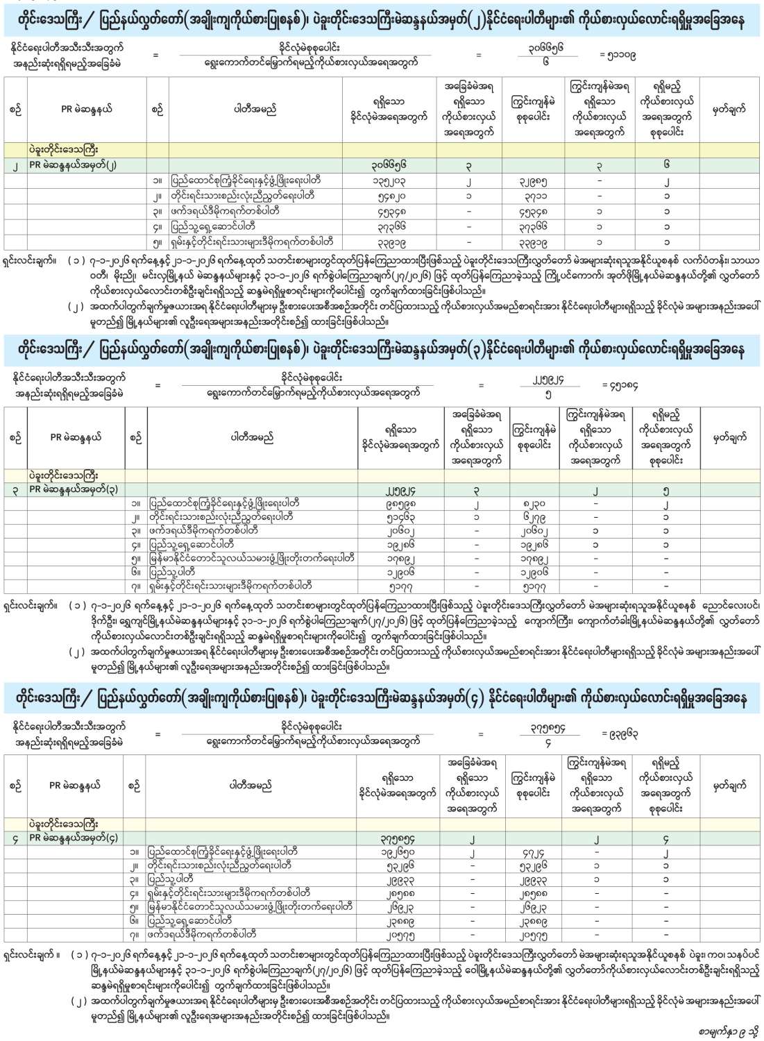 တိုင်းဒေသကြီး/ပြည်နယ်လွှတ်တော်(အချိုးကျကိုယ်စားပြုစနစ်)၊ ပဲခူးတိုင်းဒေသကြီးမဲဆန္ဒနယ်အမှတ်(၁)၊ (၂)၊ (၃)၊ (၄)၊ (၅) နိုင်ငံရေးပါတီများ၏ ကိုယ်စားလှယ်လောင်းရရှိမှုအခြေအနေ