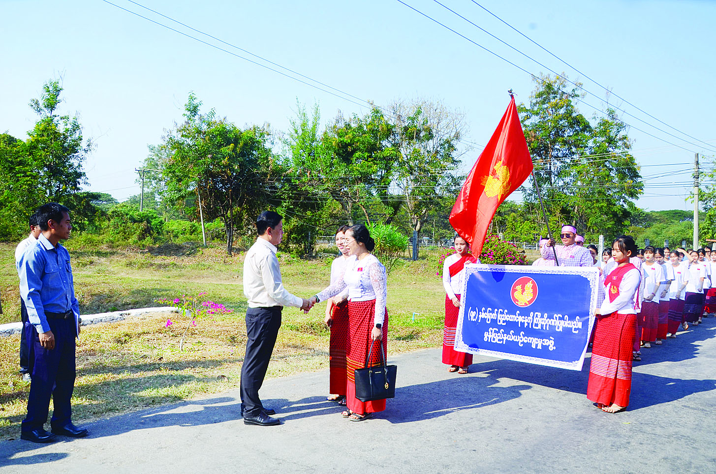 ၂၀၂၆ ခုနှစ် (၇၉) နှစ်မြောက် ပြည်ထောင်စုနေ့အခမ်းအနားသို့ တက်ရောက်မည့် တိုင်းဒေသကြီးနှင့်ပြည်နယ်ကိုယ်စားပြု ယဉ်ကျေးမှုအဖွဲ့များသည် ယနေ့မွန်းလွဲပိုင်းတွင် ပြည်ထောင်စုနယ်မြေ နေပြည်တော်စည်ပင်ဧည့်ရိပ်သာသို့ ဆက်လက်ရောက်ရှိလာရာ (၇၉) နှစ်မြောက် ပြည်ထောင်စုနေ့အခမ်းအနားကျင်းပရေး၊ ယဉ်ကျေးမှုအဖွဲ့များ ကြိုဆိုနေရာချထားရေးနှင့် ဧည့်ခံကျွေးမွေးရေးဆပ်ကော်မတီအတွင်းရေးမှူးနှင့် အဖွဲ့ဝင်များ၊ ဌာနဆိုင်ရာတာဝန်ရှိသူများက နွေးထွေးလှိုက်လှဲစွာ ကြိုဆိုနှုတ်ဆက်ကြသည်။