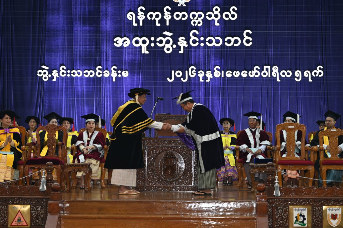 ယင်းနောက် ရန်ကုန်တက္ကသိုလ်ပါမောက္ခချုပ်က အထူးဘွဲ့နှင်းသဘင် အခမ်းအနားကျင်းပကြောင်း ကြေညာပြီး ပညာရေးဝန်ကြီးဌာန ပြည်ထောင်စုဝန်ကြီး ဒေါက်တာချောချောစိန်က နိုင်ငံတော်ယာယီသမ္မတ နိုင်ငံတော်လုံခြုံရေးနှင့် အေးချမ်းသာယာရေးကော်မရှင်ဥက္ကဋ္ဌ ဗိုလ်ချုပ်မှူးကြီး မင်းအောင်လှိုင်၏ စွမ်းဆောင်ရည်များအား ဖတ်ကြားတင်ပြသည်။