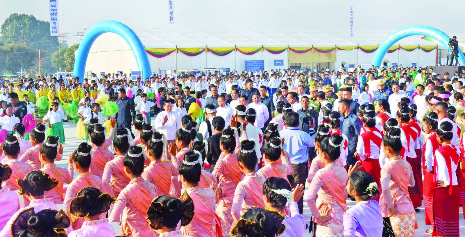 ဆက်လက်၍ နိုင်ငံတော်ယာယီသမ္မတ နိုင်ငံတော်လုံခြုံရေးနှင့်အေးချမ်းသာယာရေးကော်မရှင်ဥက္ကဋ္ဌနှင့် အခမ်းအနားတက်ရောက်လာကြသူများသည် ၂၀၂၆ ခုနှစ် (၇၉)နှစ်မြောက် ပြည်ထောင်စုနေ့အထိမ်းအမှတ် ပြည်ထောင်စုအဆင့် MSME ထုတ်ကုန်ပြပွဲနှင့် ဈေးရောင်းပွဲတော်အခမ်းအနား ဂုဏ်ပြုတေးသီချင်းဖြစ်သည့် “စက်မှုကုန်စည်ပြပွဲဆီ” သီချင်းနှင့်အတူ တိုင်းဒေသကြီးနှင့်ပြည်နယ်များမှ တိုင်းရင်းသား ယဉ်ကျေးမှုအဖွဲ့များ၏ ကပြဖျော်ဖြေတင်ဆက်မှု အားကြည့်ရှုအားပေးကြသည်။