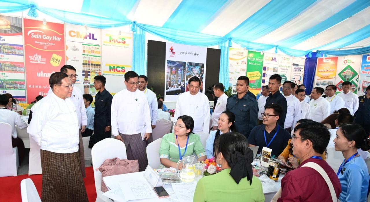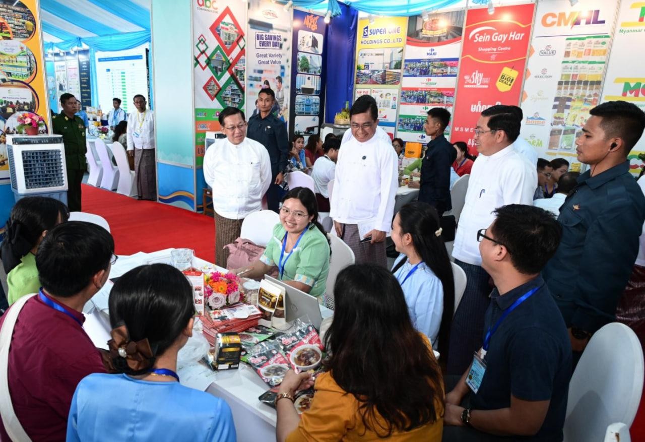 ထိုသို့လှည့်လည်ကြည့်ရှုရာတွင် နိုင်ငံတော်ယာယီသမ္မတ နိုင်ငံတော်လုံခြုံရေးနှင့်အေးချမ်းသာယာရေးကော်မရှင်ဥက္ကဋ္ဌနှင့် အဖွဲ့ဝင်များသည် ၂၀၂၆ ခုနှစ်၊ (၇၉) နှစ်မြောက် ပြည်ထောင်စုနေ့အထိမ်းအမှတ် ပြည်ထောင်စုအဆင့် MSME ထုတ်ကုန်ပြပွဲနှင့် ဈေးရောင်းပွဲတော်၌ ပါဝင်ခင်းကျင်းပြသထားသည့် စီးပွားရေးနှင့်ကူးသန်းရောင်းဝယ်ရေးဝန်ကြီးဌာန ပြည်ပဈေးကွက်ချိတ်ဆက်ရေးလုပ်ငန်းအဖွဲ့ပြခန်း၊ ပြည်တွင်းဈေးကွက်ချိတ်ဆက်ရေးလုပ်ငန်းအဖွဲ့ပြခန်း၊ ဝန်ကြီးဌာနများနှင့် ချိတ်ဆက်ရေးလုပ်ငန်းအဖွဲ့ပြခန်းများအတွင်း MSME ကုန်ထုတ်လုပ်ငန်းများဆောင်ရွက်လျက်ရှိသည့် လုပ်ငန်းရှင်များ၏ ပြည်တွင်းပြည်ပဈေးကွက်ရရှိရေး တွေ့ဆုံဆွေးနွေးချိတ်ဆက်ဆောင်ရွက်နေမှုများကို လှည့်လည်ကြည့်ရှုအားပေးကြသည်။