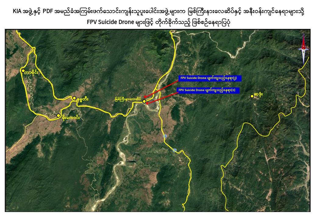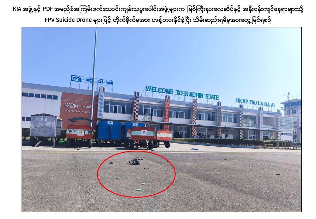 ထိုသို့ ဆောင်ရွက်လျက်ရှိရာ အကြမ်းဖက်သောင်းကျန်းသူပူးပေါင်းအဖွဲ့များက ယနေ့နံနက်ပိုင်းတွင် ကချင်ပြည်နယ်၊ မြစ်ကြီးနားမြို့၊ ပန်းမတီးရပ်ကွက်ရှိ မြစ်ကြီးနားလေဆိပ်နှင့် အနီးဝန်ကျင်နေရာများသို့ FPV Suicide Drone များအသုံးပြု၍ တိုက်ခိုက်ခဲ့ရာ လေကြောင်းလုံခြုံရေးတာဝန်များ ထမ်းဆောင်လျက်ရှိသည့် လုံခြုံရေးတပ်ဖွဲ့ဝင်များက လေကြောင်းရန်ကာကွယ်ရေးစနစ်များဖြင့် ထောက်လှမ်းသိရှိခဲ့ပြီး အဆိုပါ Drone ယာဉ်များအား လက်ဦးမှုရယူဟန့်တားနိုင်ခဲ့သည်။ ယင်းသို့ဆောင်ရွက်နိုင်ခဲ့ခြင်းကြောင့် လေဆိပ်အတွင်း ကျရောက်ပေါက်ကွဲခြင်းမရှိဘဲ လေယာဉ်ပြေးလမ်းနှင့် အနီးဝန်းကျင်နေရာများတွင်သာ မြေပြင်ပေါ်သို့ ပျက်ကျခဲ့ပြီး လုံခြုံရေးတပ်ဖွဲ့ဝင်များက အများပြည်သူများ အန္တရာယ်ကင်းရှင်းစေရန်အတွက် Drone ယာဉ်များတွင် ပါရှိသည့် ဖောက်ခွဲဖျက်ဆီးရေးပစ္စည်းများအား စနစ်တကျ သက်မဲ့ပြုလုပ်ခြင်းများ ဆောင်ရွက်ခဲ့သည်။ ဖြစ်စဉ်တွင် လူ၊ အဆောက်အအုံနှင့် လေယာဉ်ပြေးလမ်းများ ထိခိုက်ပျက်စီးမှုမရှိခဲ့ကြောင်း သိရှိရသည်။