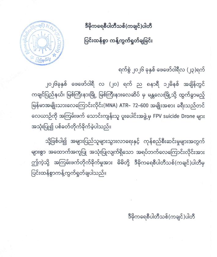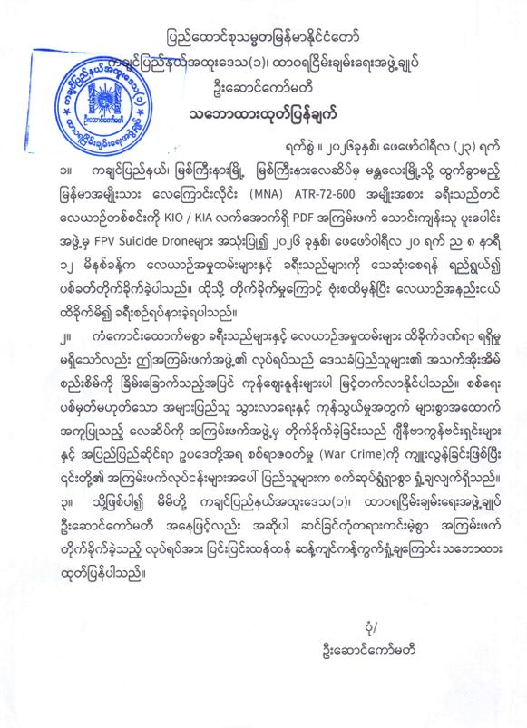 မြစ်ကြီးနားလေဆိပ်မှ ခရီးသည်တင်လေယာဉ်အား KIA အဖွဲ့နှင့် PDF အမည်ခံအကြမ်းဖက်သောင်းကျန်းသူ ပူးပေါင်းအဖွဲ့များက ယုတ်မာပက်စက်စွာ FPV suicide drone များဖြင့် ပစ်ခတ်တိုက်ခိုက်ခဲ့မှုအပေါ် ပြင်းထန်စွာ ကန့်ကွက်ရှုတ်ချကြောင်း သဘောထားများထုတ်ပြန်